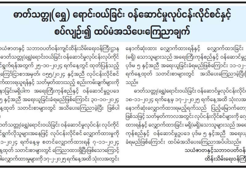ဓာတ်သတ္တု (ရွှေ) ရောင်းဝယ်ခြင်း ဝန်ဆောင်မှုလုပ်ငန်းလိုင်စင်နှင့် စပ်လျဉ်း၍ ထပ်မံအသိပေးကြေညာချက်