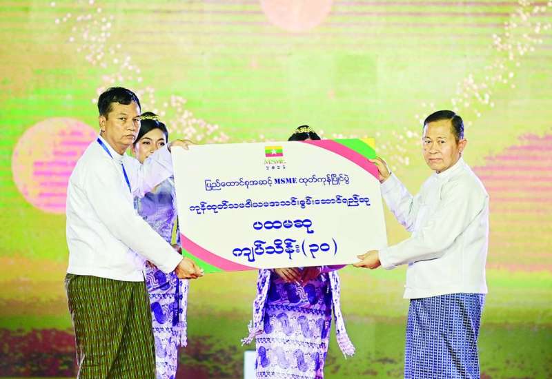 ပြည်ထောင်စုအဆင့် MSME ထုတ်ကုန်ပြပွဲနှင့်ပြိုင်ပွဲ၏ ဆုချီးမြှင့်ခြင်းအခမ်းအနားကို ယနေ့ညနေပိုင်းတွင် နေပြည်တော်ရှိ ဥပ္ပါတသန္တိစေတီတော် တပေါင်းကွင်း၌ ကျင်းပပြုလုပ်ရာ အသေးစား၊ အငယ်စားနှင့်အလတ်စားစီးပွားရေးလုပ်ငန်းများ ဖွံ့ဖြိုးတိုးတက်ရေးလုပ်ငန်းကော်မတီဥက္ကဋ္ဌ နိုင်ငံတော်စီမံအုပ်ချုပ်ရေးကောင်စီ ဒုတိယဥက္ကဋ္ဌ ဒုတိယဝန်ကြီးချုပ် ဒုတိယဗိုလ်ချုပ်မှူးကြီး စိုးဝင်းတက်ရောက်၍ ဆုများပေးအပ်ချီးမြှင့်သည်။