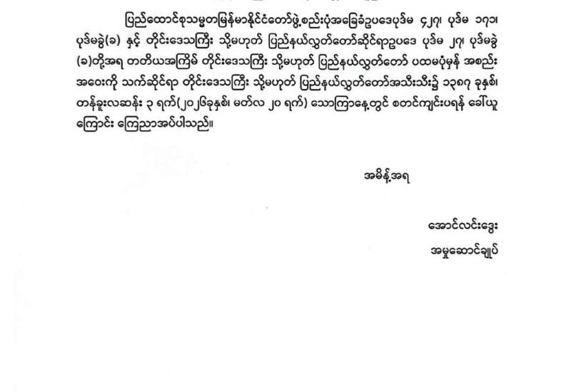 တတိယအကြိမ် တိုင်းဒေသကြီး သို့မဟုတ် ပြည်နယ်လွှတ်တော် ပထမပုံမှန်အစည်းအဝေးကျင်းပရန်ခေါ်ယူခြင်း