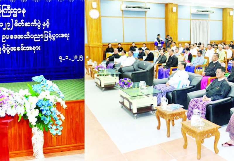 ဥပဒေရေးရာဝန်ကြီးဌာန၏ မဟာဗျူဟာစီမံကိန်း (၂၀၂၅-၂၀၂၉) မိတ်ဆက်ပွဲနှင့် နိုင်ငံ့ဝန်ထမ်း အကြီးအမှူးများအတွက် ဥပဒေအသိပညာပြန့်ပွားရေး သင်တန်းအမှတ်စဉ် (၅) ဖွင့်ပွဲအခမ်းအနားကို ယနေ့နံနက် ၉ နာရီက နေပြည်တော်ဥတ္တရသီရိမြို့နယ်ရှိ ဥပဒေအသိပညာ ပြန့်ပွားရေးသင်တန်း၌ ကျင်းပသည်။