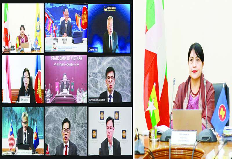 (၂၂) ကြိမ်မြောက် အာဆီယံဗဟိုဘဏ်ဥက္ကဋ္ဌများ အစည်းအဝေး (22ndASEAN Central Bank Governors’ Meeting-ACGM)၊ (၁၃) ကြိမ်မြောက် အာဆီယံဘဏ္ဍာရေးဝန်ကြီးများနှင့် ဗဟိုဘဏ်ဥက္ကဋ္ဌများအစည်းအဝေး (13th ASEAN Finance Ministers’ and Central Bank Governors’ Meeting-AFMGM) နှင့် ဆက်စပ်အစည်းအဝေးများကို ဧပြီ ၉ ရက်နှင့် ၁၀ ရက်တို့တွင် ဖိလစ်ပိုင်နိုင်ငံမှ အိမ်ရှင်အဖြစ်ကြီးမှူး၍ Fully Virtual စနစ်ဖြင့်ကျင်းပရာ မြန်မာနိုင်ငံတော်ဗဟိုဘဏ်ဒုတိယဥက္ကဋ္ဌ ဒေါက်တာစန္ဒာဦး ခေါင်းဆောင်သည့်ကိုယ်စားလှယ်အဖွဲ့ Video Conferencing ဖြင့် တက်ရောက်သည်။