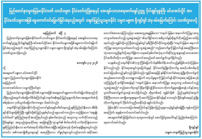 ပြည်ထောင်စုသမ္မတ မြန်မာနိုင်ငံတော် ယာယီသမ္မတ နိုင်ငံတော်လုံခြုံရေးနှင့် အေးချမ်းသာယာရေးကော်မရှင်ဥက္ကဋ္ဌ ဗိုလ်ချုပ်မှူးကြီး မင်းအောင်လှိုင် အား နိုင်ငံတော်သမ္မတအဖြစ် ရွေးကောက်တင်မြှောက်ခံရခြင်းအတွက် ရုရှားဖက်ဒရေးရှင်းနိုင်ငံ နိုဗိုစီဗစ်ဒေသ အုပ်ချုပ်ရေးမှူး မစ္စတာ တာရာ့နီကော့ဗ် အန်ဒရေ အလက်ဇန်ဒရိုဗစ်ချ်ထံမှ ဝမ်းမြောက်ကြောင်း သဝဏ်လွှာပေးပို့