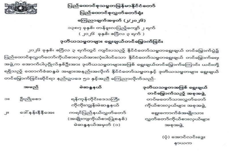 တတိယအကြိမ် ပြည်ထောင်စုလွှတ်တော် နိုင်ငံတော်သမ္မတ ရွေးချယ်တင်မြှောက်ပွဲကို ယနေ့နံနက် ၁၀ နာရီတွင် နေပြည်တော်ရှိ လွှတ်တော်အဆောက်အအုံ ပြည်ထောင်စုလွှတ်တော် အစည်းအဝေးခန်းမ၌ ကျင်းပသည်။