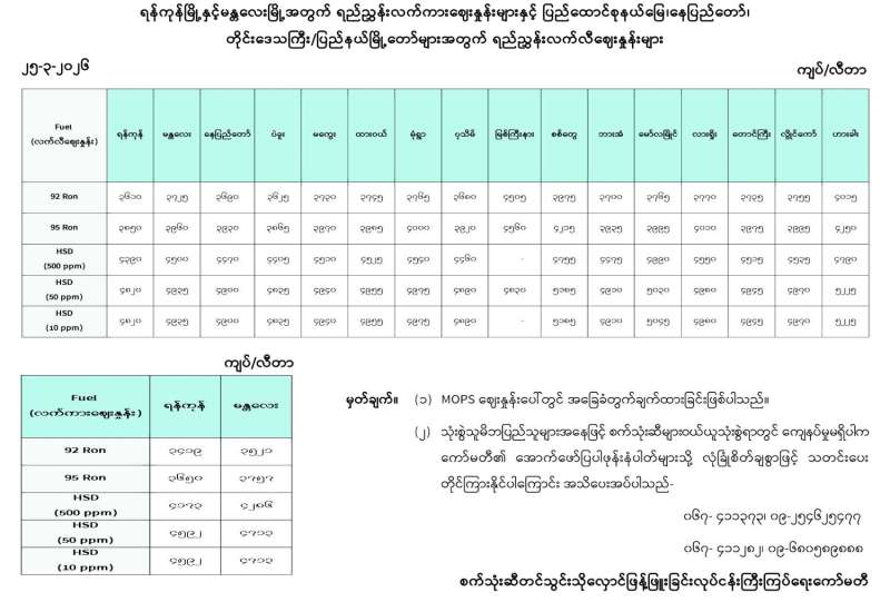 ရန်ကုန်မြို့နှင့် မန္တလေးမြို့အတွက် ရည်ညွှန်းလက်ကားဈေးနှုန်းများနှင့် ပြည်ထောင်စုနယ်မြေ နေပြည်တော်၊ တိုင်းဒေသကြီး/ပြည်နယ် မြို့တော်များအတွက် ရည်ညွှန်းလက်လီဈေးနှုန်းများ