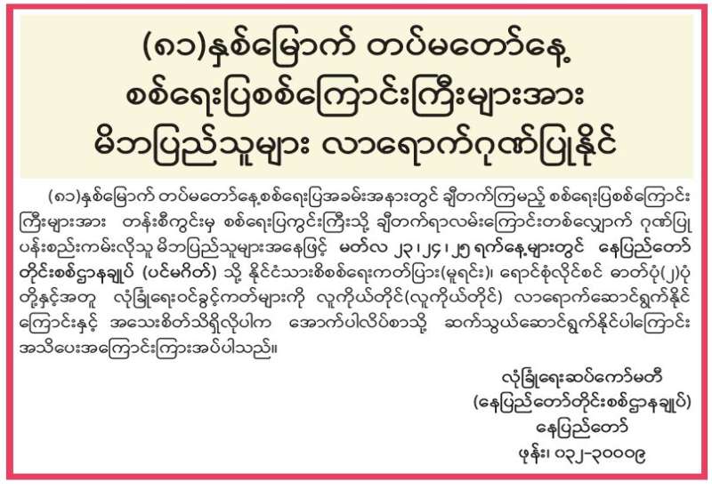 အကြမ်းဖက်အုပ်စုအဖြစ်ကြေညာထားသည့် CRPH ၊ NUG နှင့် ယင်းတို့၏ လက်ဝေခံအဖွဲ့အစည်းများ၊ ယင်းတို့နှင့် ဆက်နွှယ်နေသော အဖွဲ့အစည်းများ၊ လူပုဂ္ဂိုလ်များသည် နိုင်ငံတော်တည်ငြိမ်အေးချမ်းရေးကို ပျက်ပြားစေရန်နှင့် အစိုးရယန္တရားများပျက်ပြားစေရန် ရည်ရွယ်လျက် လှုံ့ဆော်ခြင်း၊ ဝါဒဖြန့်ခြင်းများပြုလုပ်ခဲ့မှုအပေါ် ဥပဒေနှင့်အညီ ထိရောက်စွာ အရေးယူသွားမည်ဖြစ်ကြောင်းနှင့် ထိုသို့လှုံ့ဆော်သူ၊ ဝါဒဖြန့်သူများအား ဆက်လက်ဖော်ထုတ်အရေးယူသွားမည်ဖြစ်ကြောင်း မိဘပြည်သူများ သိရှိနိုင်ရေး အသိပေးသတင်းထုတ်ပြန်ပြီးဖြစ်သည်။