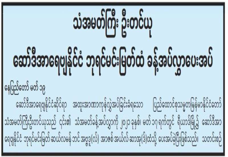 ပြည်ထောင်စုသမ္မတမြန်မာနိုင်ငံတော် အဋ္ဌမအကြိမ် နိုင်ငံတော်သံဃမဟာနာယကအဖွဲ့ (၄၇)ပါး စုံညီ ဆဋ္ဌအစည်းအဝေးနှင့် သတ္တမအစည်းအဝေးကို ယနေ့နံနက်(၈)နာရီတွင် ရန်ကုန် မြို့၊ သီရိမင်္ဂလာ ကမ္ဘာအေးကုန်းမြေရှိ မဟာပါသာဏလိုဏ်ဂူ သိမ်တော်ကြီး၌ ကျင်းပသည်။