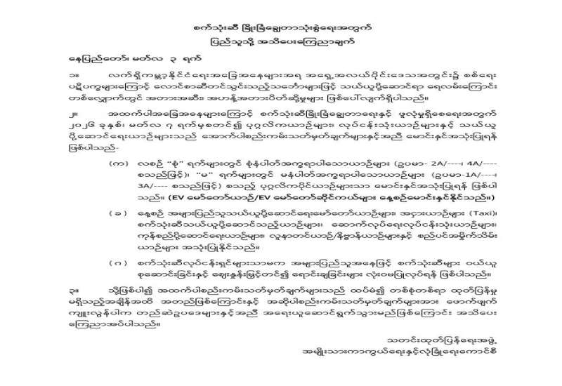 စက်သုံးဆီ ခြိုးခြံချွေတာသုံးစွဲရေးအတွက် ပြည်သူသို့ အသိပေးကြေညာချက်