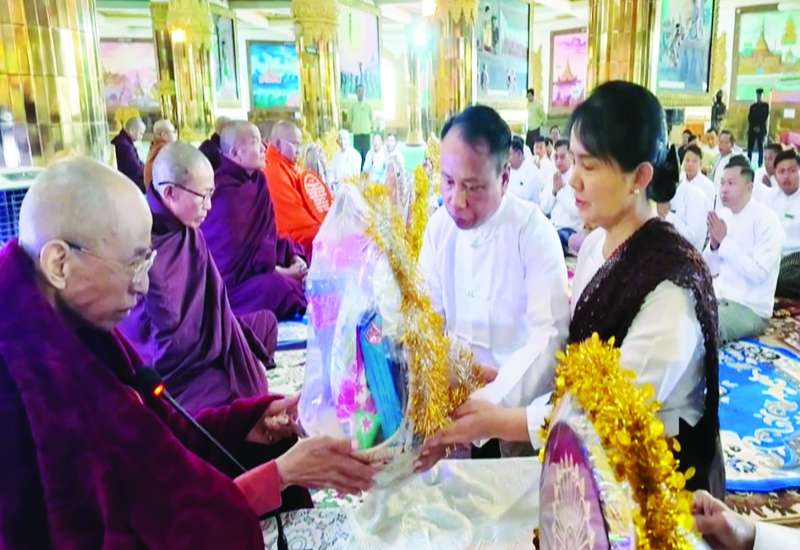 ၂၀၂၆ ခုနှစ် သာသနာတော်ဆိုင်ရာ ဘွဲ့တံဆိပ်တော်များ ဆက်ကပ်ပူဇော်ခြင်း မဟာမင်္ဂလာအခမ်းအနားနှင့် ဆွမ်းဆန်စိမ်းလောင်းလှူပွဲအခမ်းအနားကို ယနေ့မွန်းလွဲပိုင်းတွင် နေပြည်တော်၊ မာရဝိဇယဗုဒ္ဓဥယျာဉ်တော် ပရိဝုဏ်အတွင်းရှိ အဂ္ဂါဓိပတိသာသနာ့ဗိမာန်တော်ကြီးအတွင်း၌ ဆင်ယင်ကျင်းပရာ ပြည်ထောင်စုသမ္မတမြန်မာ နိုင်ငံတော်ယာယီသမ္မတ နိုင်ငံတော်လုံခြုံရေးနှင့်အေးချမ်းသာယာရေးကော်မရှင်ဥက္ကဋ္ဌ ဗိုလ်ချုပ်မှူးကြီး မင်းအောင်လှိုင်နှင့်ဇနီး ဒေါ်ကြူကြူလှတို့ တက်ရောက်ကြည်ညို၍ သာသနာတော်ဆိုင်ရာဘွဲ့တံဆိပ်တော်များ ဆက်ကပ်ပူဇော်ပြီး ဆွမ်းဆန်စိမ်းများနှင့် လှူဖွယ်ဝတ္ထုပစ္စည်းများ လောင်းလှူကြသည်။