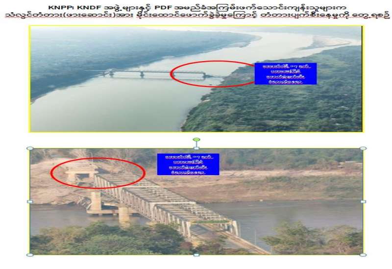 KNPP၊ KNDF အဖွဲ့များနှင့် PDF အမည်ခံ အကြမ်းဖက်သောင်းကျန်းသူများသည် တိုင်းပြည်တည်ငြိမ်အေးချမ်းမှုပျက်ပြားစေရန်နှင့် ဒေသတွင်းကုန်စည်စီးဆင်းမှုများ ပျက် ပြားစေရန်ရည်ရွယ်၍ အများပြည်သူသွားလာအသုံးပြုလျက်ရှိသည့် လမ်း၊ တံတားများ အားမိုင်းထောင်ဖောက်ခွဲဖျက်ဆီးခြင်းများကို ယုတ်မာရိုင်းစိုင်းစွာ ဥပဒေမဲ့ကျူးလွန်လျက်ရှိကြရာ ဖားဆောင်းမြို့အနီးရှိ သံလွင်မြစ်ကူးတံတားတစ်စင်းဖြစ်သော သံလွင်တံတား (ဖားဆောင်း) အား အကြမ်းဖက်သမားများက ယနေ့နံနက်ပိုင်းတွင် ဒုတိယအကြိမ် ထပ်မံ၍ ယုတ်မာရိုင်းစိုင်းစွာ မိုင်းထောင်ဖောက်ခွဲဖျက်ဆီးခဲ့ကြောင်း သိရှိရသည်။