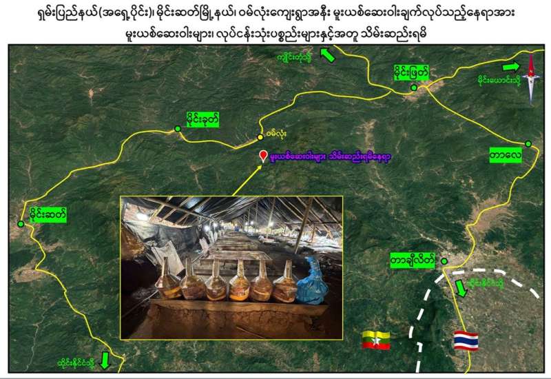 နိုင်ငံတော်အစိုးရနှင့် တပ်မတော်အနေဖြင့် မူးယစ်ဆေးဝါးများ တားဆီးနှိမ်နင်းရေးလုပ်ငန်းများကို အမျိုးသားရေးတာဝန်တစ်ရပ်အဖြစ်ခံယူ၍ သက်ဆိုင်ရာအဖွဲ့အစည်းများနှင့် ပူးပေါင်းကာ နိုင်ငံတစ်ဝန်း မူးယစ်းဆေးဝါးထုတ်လုပ်မှုနှင့် တရားမဝင်ရောင်းဝယ်မှုများ တားဆီးကာကွယ်နှိမ်နင်းရေးလုပ်ငန်းများကို အင်တိုက်အားတိုက် စဉ်ဆက်မပြတ် ဆောင်ရွက်လျက်ရှိရာ ဖေဖော်ဝါရီလ ၂၄ ရက် မွန်းလွဲပိုင်းတွင် ရှမ်းပြည်နယ် (အရှေ့ပိုင်း)၊ မိုင်းဆတ်ခရိုင်၊မိုင်းခုတ်မြို့အနီး၌ မူးယစ်ဆေးဝါးများနှင့် မူးယစ်ဆေးဝါးချက်လုပ်ရာတွင် အသုံးပြုသည့် ဆက်စပ်ပစ္စည်းများကို သိမ်းဆည်းရမိခဲ့ကြောင်း သိရှိရသည်။