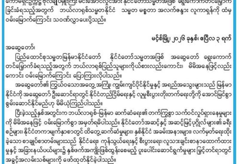 ပြည်ထောင်စုသမ္မတမြန်မာနိုင်ငံတော် ယာယီသမ္မတ နိုင်ငံတော်လုံခြုံရေးနှင့် အေးချမ်းသာယာရေးကော်မရှင်ဥက္ကဋ္ဌ ဗိုလ်ချုပ်မှူးကြီး မင်းအောင်လှိုင် အား နိုင်ငံတော်သမ္မတအဖြစ် ရွေးကောက်တင်မြှောက်ခြင်းခံရသည့်အတွက် ဘယ်လာရုစ်သမ္မတနိုင်ငံ သမ္မတ မစ္စတာ အလက်ဇန္ဒား လူကာရှန်ကို ထံမှ ဝမ်းမြောက်ကြောင်းသဝဏ်လွှာပေးပို့