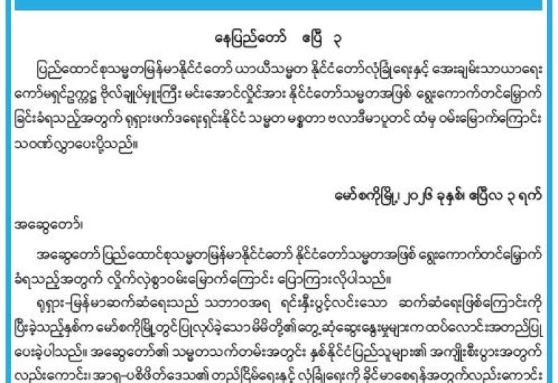 ပြည်ထောင်စုသမ္မတမြန်မာနိုင်ငံတော် ယာယီသမ္မတ နိုင်ငံတော်လုံခြုံရေးနှင့် အေးချမ်းသာယာရေးကော်မရှင်ဥက္ကဋ္ဌ ဗိုလ်ချုပ်မှူးကြီး မင်းအောင်လှိုင်အား နိုင်ငံတော်သမ္မတအဖြစ် ရွေးကောက်တင်မြှောက်ခြင်းခံရသည့်အတွက် ရုရှားဖက်ဒရေးရှင်းနိုင်ငံ သမ္မတ မစ္စတာ ဗလာဒီမာပူတင် ထံမှ ဝမ်းမြောက်ကြောင်းသဝဏ်လွှာပေးပို့