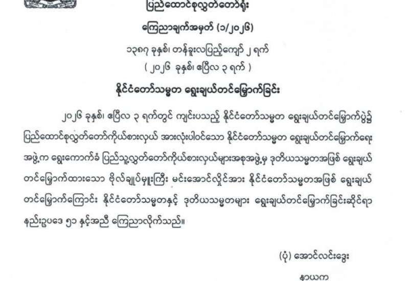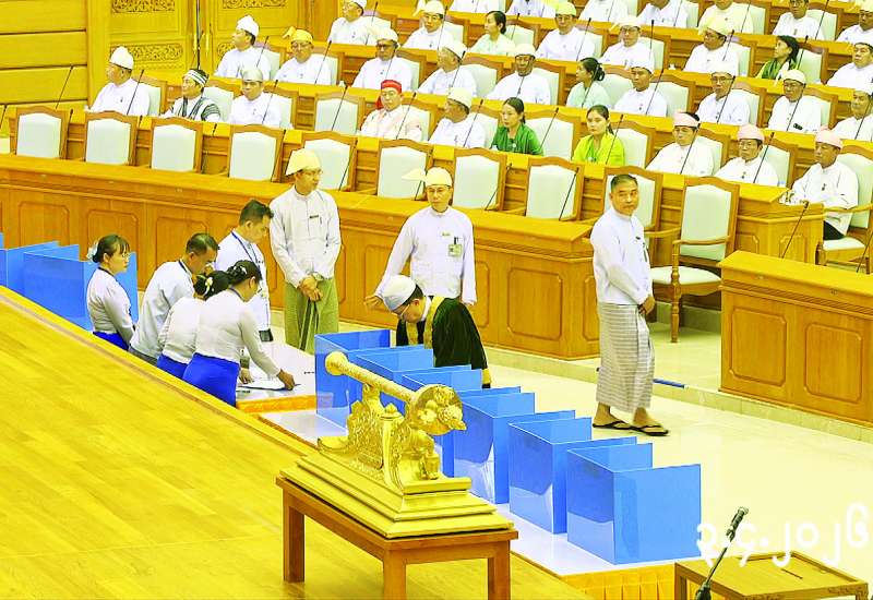 တတိယအကြိမ် ပြည်ထောင်စုလွှတ်တော် နိုင်ငံတော်သမ္မတ ရွေးချယ်တင်မြှောက်ပွဲကို ယနေ့နံနက် ၁၀ နာရီတွင် နေပြည်တော်ရှိ လွှတ်တော်အဆောက်အအုံ ပြည်ထောင်စုလွှတ်တော် အစည်းအဝေးခန်းမ၌ ကျင်းပသည်။