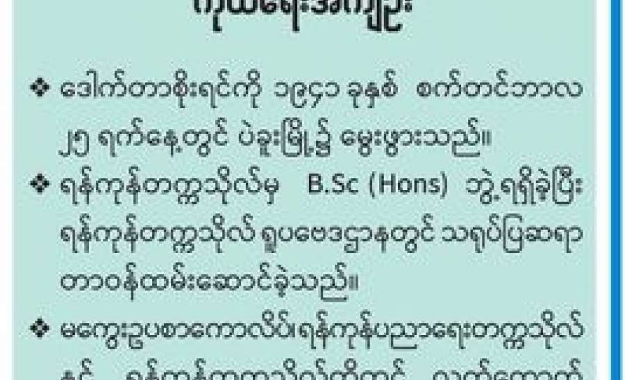 ရန်ကုန်တက္ကသိုလ် ရာပြည့်အထိမ်းအမှတ်အနေဖြင့် ကြေးမုံသတင်းစာအထူးကဏ္ဍတွင် ကျောင်းသား ကျောင်းသူ ဟောင်းများက ဆောင်းပါးပေါင်းစုံရေးသားကြရာ အားပါတရ တဝကြီးဖတ်ရသဖြင့် များစွာဝမ်းသာ ကျေးဇူးတင်မိပါသည်။ ရသစုံခံစားရပါသည်။ ရန်ကုန် တက္ကသိုလ်၏ သမိုင်း၊ မြကျွန်းညိုတက္ကသိုလ်၏ အလှ၊ ပျော်ရွှင်ဖွယ်ရာ၊ လွမ်းဆွတ်ဖွယ်ရာ အဖြစ်အပျက်များကို ပြန်ပြောင်းသတိရမိပါသည်။ ပြန်မရနိုင်သော အချိန်အခါ များဖြစ်သည်မို့ မြတ်နိုးစွာ တန်ဖိုးထားမိပါသည်။