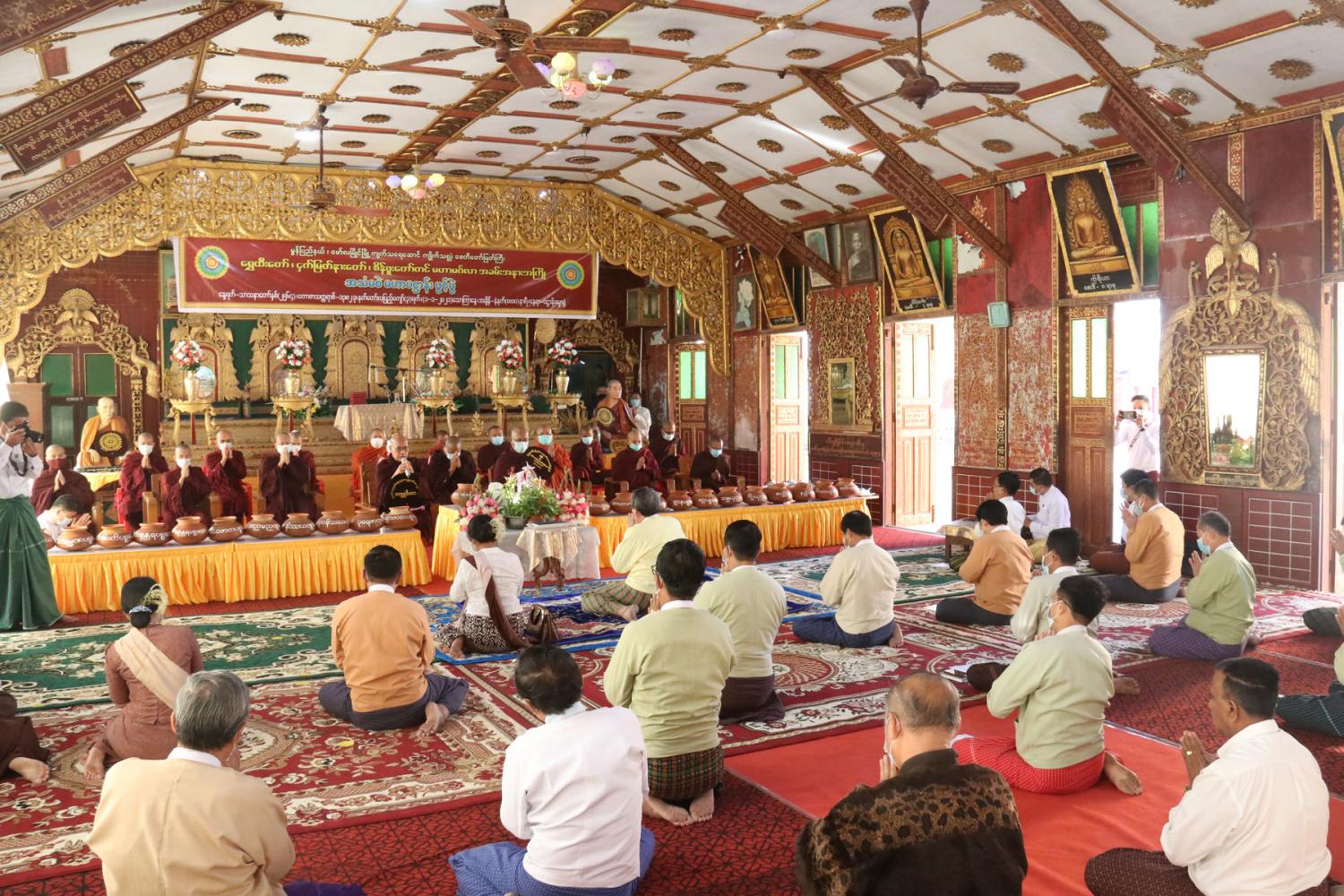 ရှေးဦးစွာ နမောတဿသုံးကြိမ်ရွတ်ဆို ဘုရားကန်တော့၍ အခမ်းအနားကို ဖွင့်လှစ်ပြီး မော်လမြိုင်မြို့ ရွှေတောင် ကျောင်းတိုက် ဦးစီးပဓာန နာယက (ဓမ္မကထိကဗဟုဇနဟိတဓရ၊ ဂန္ထဝါစက ပဏ္ဍိတ၊ အဂ္ဂမဟာသဒ္ဓမ္မ ဇောတိကဓဇ) ဘဒ္ဒန္တဝိမလ ဆရာတော်အရှင်သူမြတ်ထံမှ မွန်ပြည်နယ်ဝန်ကြီးချုပ်နှင့် ဧည့်ပရိသတ် အပေါင်းတို့က ငါးပါးသီလခံယူ ဆောက်တည်ကြသည်။
