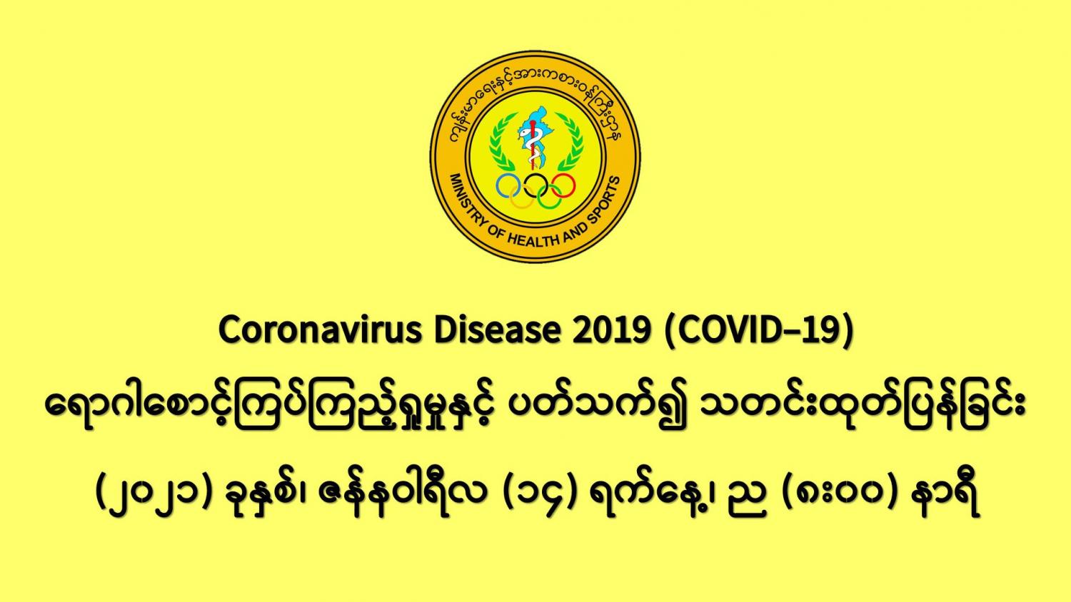 COVID-19 ရောဂါစောင့်ကြပ်ကြည့်ရှုမှုနှင့်ပတ်သက်၍ သတင်းထုတ်ပြန်ခြင်း 01/14/2021 (၁၄-၁-၂၀၂၁) ရက်နေ့၊ ည (၈:၀၀)နာရီ (၁၃-၁-၂၀၂၁) ရက်နေ့၊ ည (၈:၀၀) နာရီမှ (၁၄-၁-၂၀၂၁) ရက်နေ့၊ ည (၈:၀၀) နာရီ အတွင်း ဓာတ်ခွဲနမူနာ စုစုပေါင်း (၁၈,၈၂၀) ခုအား စစ်ဆေးပြီးစီးခဲ့ရာ COVID-19 ရောဂါ ဓာတ်ခွဲ အတည်ပြု လူနာသစ် (၆၀၅) ဦး တွေ့ရှိရပါသည်။ #Ministry_of_Health_and_Sports, #MoHS, #COVID19LabResults, #ကိုရိုနာဗိုင်းရပ်စ်, #ဓာတ်ခွဲအဖြေ https://www.mohs.gov.mm/