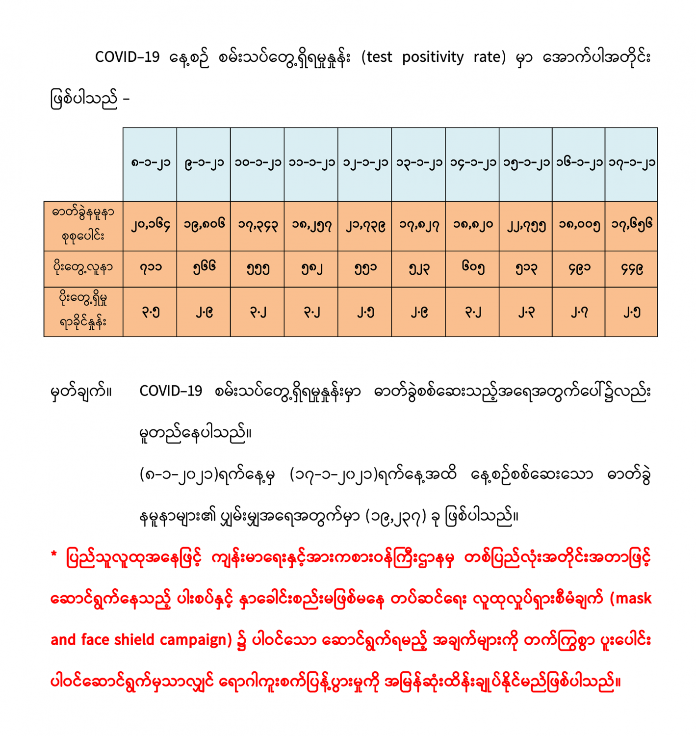 COVID-19 ရောဂါစောင့်ကြပ်ကြည့်ရှုမှုနှင့်ပတ်သက်၍ သတင်းထုတ်ပြန်ခြင်း (၁၇-၁-၂၀၂၁) ရက်နေ့၊ ည (၈:၀၀)နာရီ 01/17/2021 (၁၆-၁-၂၀၂၁) ရက်နေ့၊ ည (၈:၀၀) နာရီမှ (၁၇-၁-၂၀၂၁) ရက်နေ့၊ ည (၈:၀၀) နာရီ အတွင်း ဓာတ်ခွဲနမူနာ စုစုပေါင်း (၁၇,၆၅၆) ခုအား စစ်ဆေးပြီးစီးခဲ့ရာ COVID-19 ရောဂါ ဓာတ်ခွဲ အတည်ပြု လူနာသစ် (၄၄၉) ဦး တွေ့ရှိရပါသည်။ #Ministry_of_Health_and_Sports, #MoHS, #COVID19LabResults, #ကိုရိုနာဗိုင်းရပ်စ်, #ဓာတ်ခွဲအဖြေ