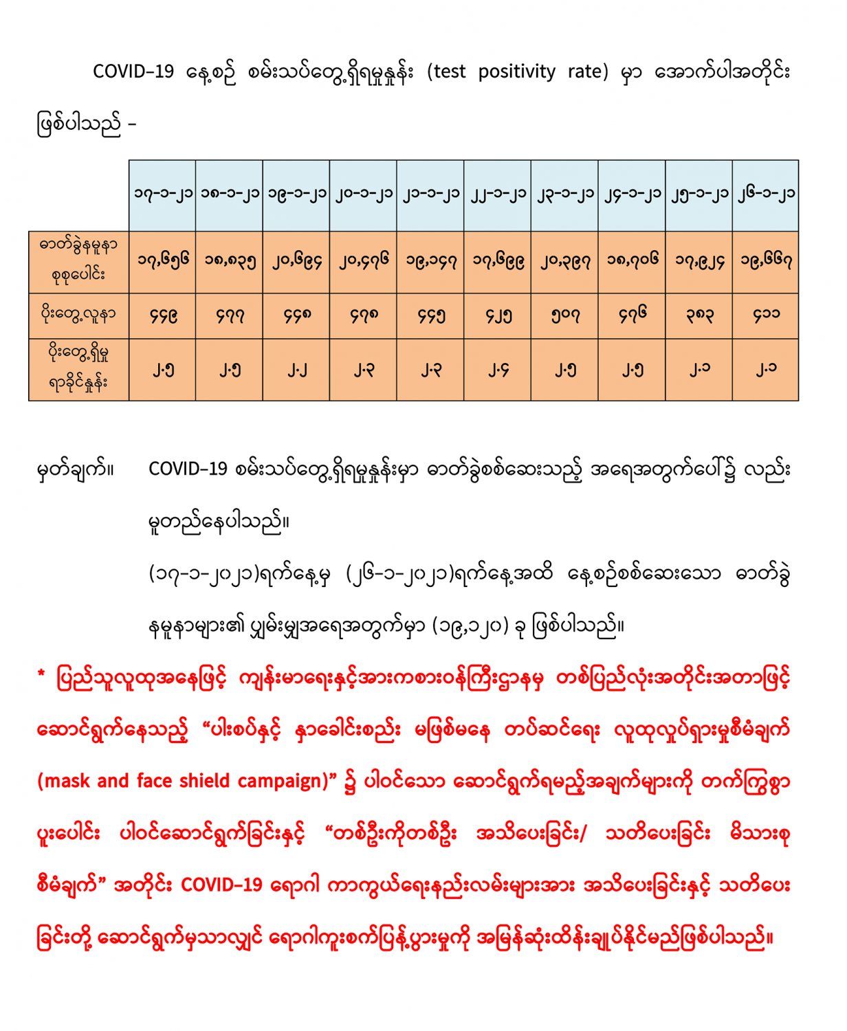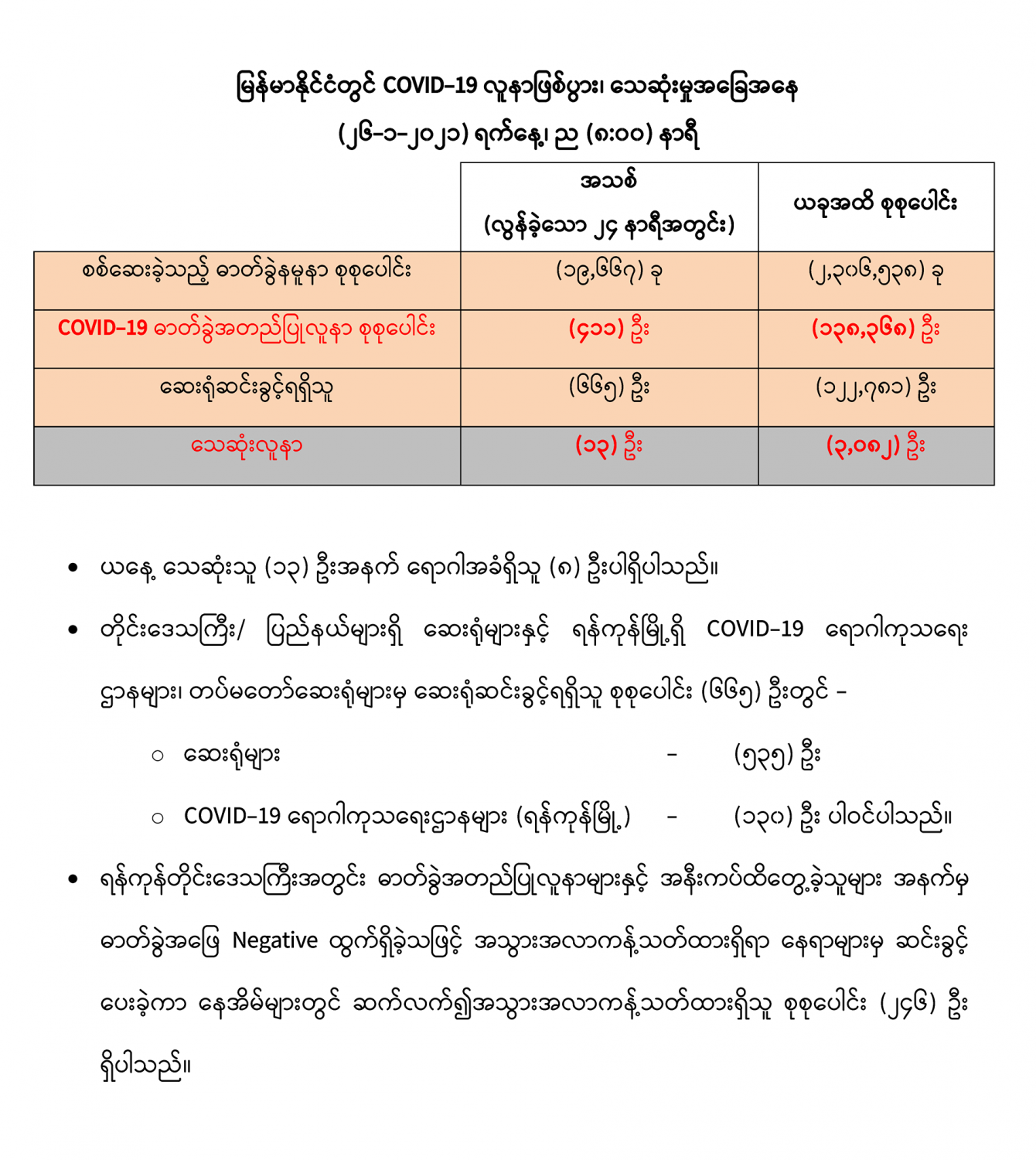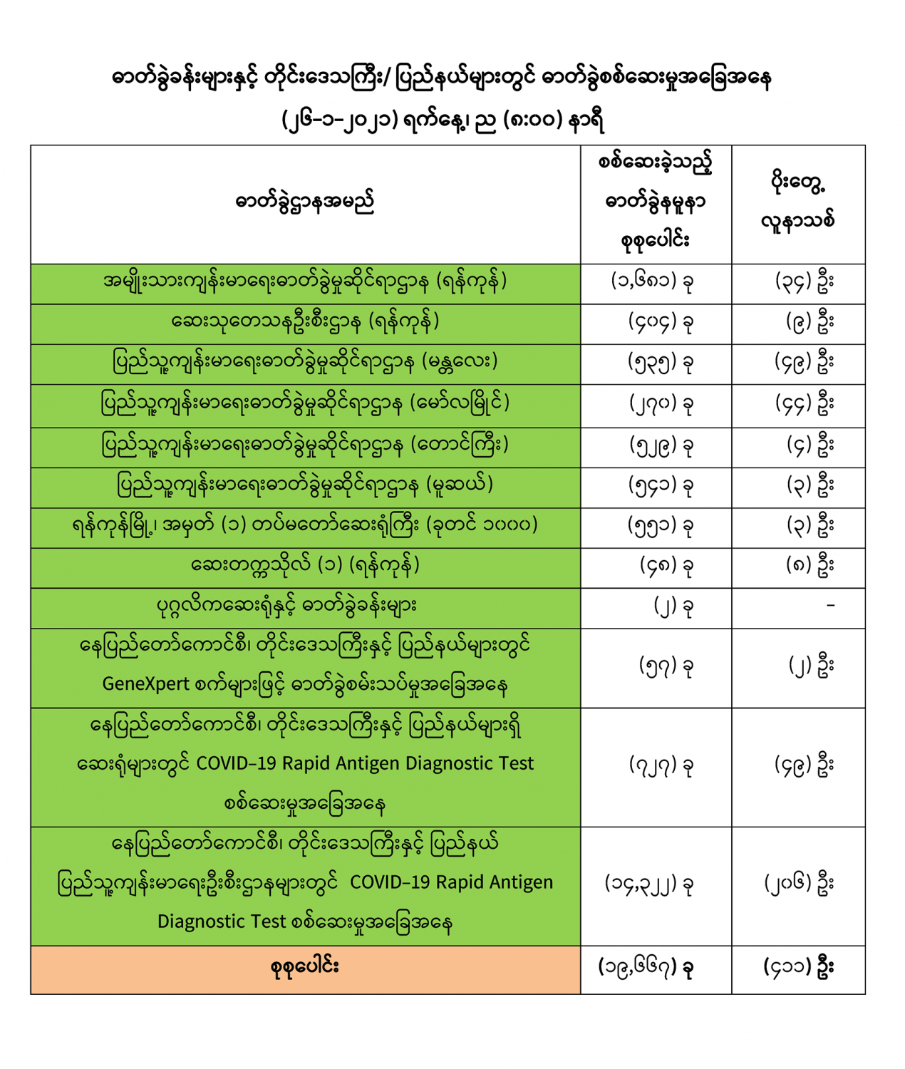 (၂၅-၁-၂၀၂၁) ရက်နေ့၊ ည (၈:၀၀) နာရီမှ (၂၆-၁-၂၀၂၁) ရက်နေ့၊ ည (၈:၀၀) နာရီ အတွင်း ဓာတ်ခွဲနမူနာ စုစုပေါင်း (၁၉,၆၆၇) ခုအားစစ်ဆေးပြီးစီးခဲ့ရာ COVID-19 ရောဂါ ဓာတ်ခွဲ အတည်ပြု လူနာသစ် (၄၁၁) ဦး တွေ့ရှိရပါသည်။