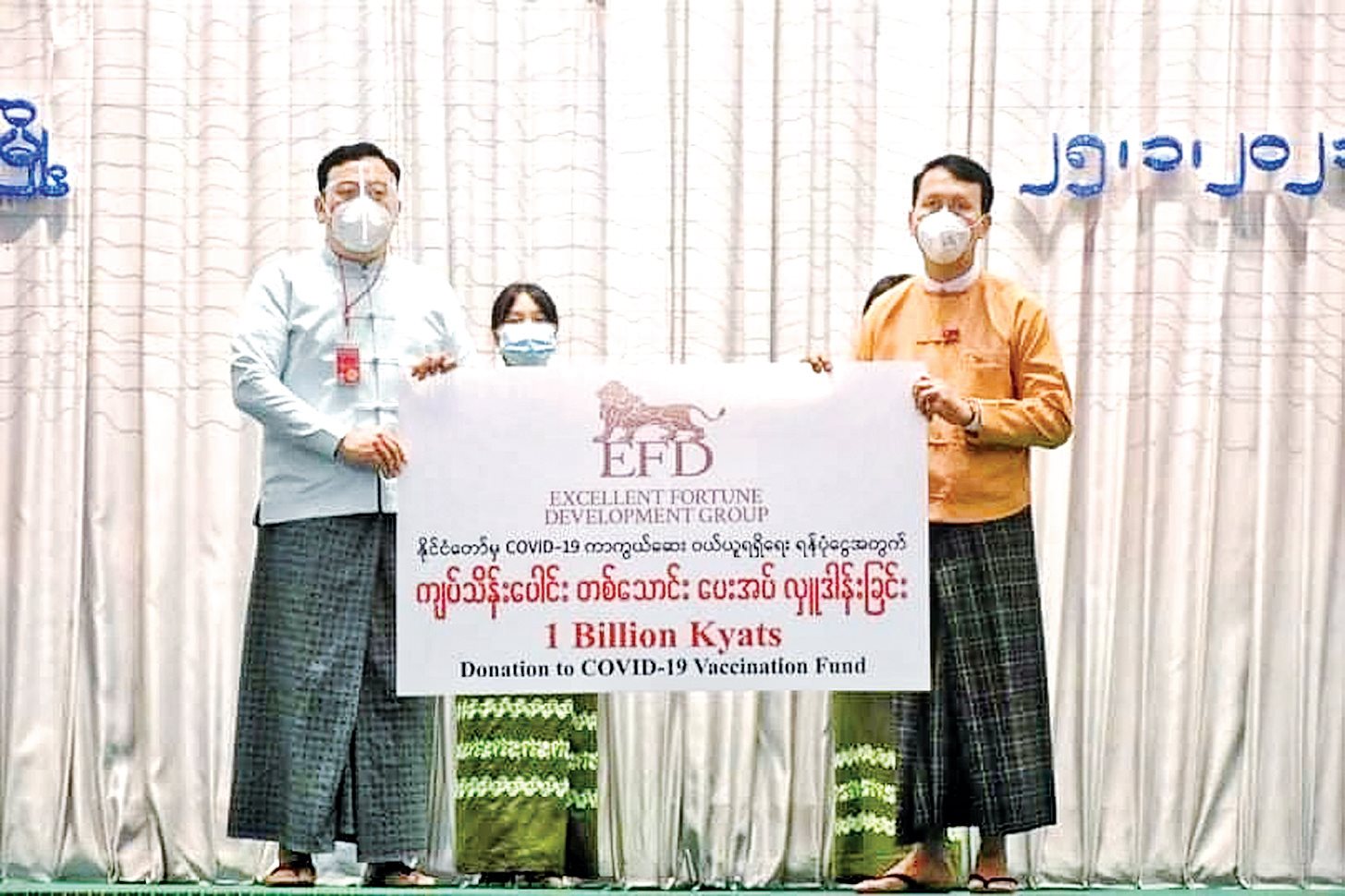 "နိုင်ငံတော်ရဲ့ ကျန်းမာရေး လိုအပ်နေချိန်မှာ ကျွန်တော်တို့ (EFD Group) အနေနဲ့ ကိုဗစ်-၁၉ ကာကွယ်ဆေး ဝယ်ယူနိုင်ဖို့အတွက် ရန်ပုံငွေအဖြစ် ကျပ်သိန်းပေါင်းတစ်သောင်းကို လှူဒါန်း ခွင့်ရလို့ ဝမ်းသာပီတိဖြစ်ရပါတယ်” ဟု EFD Group တည်ထောင်သူ ဦးစိုင်းမျိုးဝင်းက ပြောသည်။