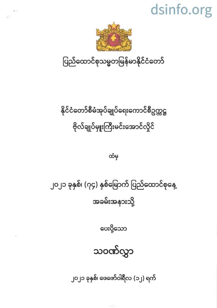 ပြည်ထောင်စုသမ္မတ မြန်မာနိုင်ငံတော် နိုင်ငံတော်စီမံအုပ်ချုပ်ရေးကောင်စီဥက္ကဋ္ဌ ဗိုလ်ချုပ်မှူးကြီး မင်းအောင်လှိုင်ထံ မှ ၂၀၂၁ ခုနှစ်၊ (၇၄) နှစ်မြောက် ပြည်ထောင်စုနေ့ အခမ်းအနားသို့ ပေးပို့သော သဝဏ်လွှာ 02/27/2021