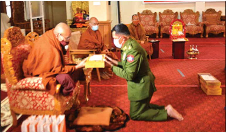 ရှမ်းပြည်နယ် (တောင်ပိုင်း)၊ တောင်ကြီးမြို့၊ ဘုရားဖြူ ရပ်ကွက်၊ ရှမ်းပြည်နယ်ဗုဒ္ဓတက္ကသိုလ် ပါမောက္ခချုပ်ဆရာတော် ဒေါက်တာ ဓမ္မသာမိ (အောက်စဖို့ဒ်ဆရာတော်) အမှူးပြုသော ဆရာတော်ကြီး များနှင့် သံဃာတော်များအား ဖေဖော်ဝါရီ ၁၁ ရက် မွန်းလွဲပိုင်းက ကာကွယ်ရေးဦးစီးချုပ်ရုံး (ကြည်း) မှ ဒုတိယဗိုလ်ချုပ်ကြီး အောင်ဇော်အေး၊ အရှေ့ပိုင်းတိုင်းစစ်ဌာနချုပ်တိုင်းမှူး ဗိုလ်မှူးချုပ် နီလင်းအောင်နှင့် အဖွဲ့ဝင်များက သွားရောက်ဖူးမြော်ကြည် ညို ကြသည်။