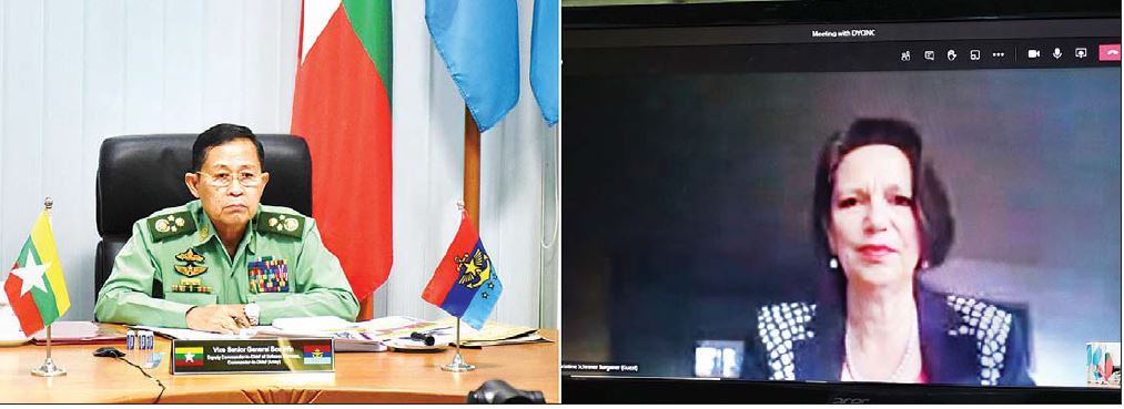 နိုင်ငံတော် စီမံအုပ်ချုပ်ရေးကောင်စီ ဒုတိယဥက္ကဋ္ဌ ဒုတိယတပ်မတော် ကာကွယ်ရေးဦးစီးချုပ် ကာကွယ်ရေး ဦးစီးချုပ်(ကြည်း) ဒုတိယဗိုလ်ချုပ်မှူးကြီး စိုးဝင်းသည် ယနေ့ မွန်းလွဲပိုင်းတွင် ကုလသမဂ္ဂ အထွေထွေအတွင်း ရေးမှူးချုပ်၏ မြန်မာနိုင်ငံဆိုင်ရာ အထူးကိုယ်စားလှယ် Ms. Christine Schraner Burgener အား Video Conferencing ဖြင့် တွေ့ဆုံ ဆွေးနွေးသည်။