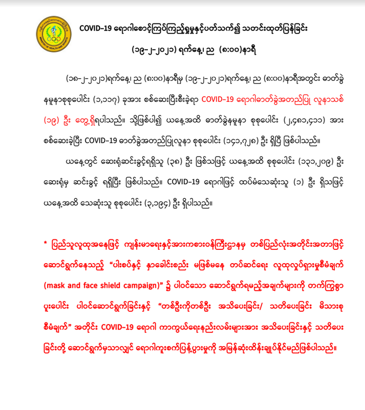 COVID-19 ရောဂါစောင့်ကြပ်ကြည့်ရှုမှုနှင့်ပတ်သက်၍ သတင်းထုတ်ပြန်ခြင်း (၁၉-၂-၂၀၂၁) ရက်နေ့၊ ည (၈:၀၀)နာရီ 03/01/2021 နေပြည်တော်