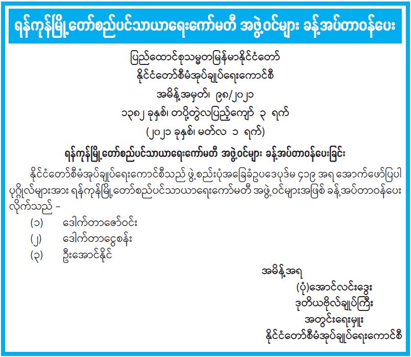 ရန်ကုန်မြို့တော်စည်ပင်သာယာရေးကော်မတီ အဖွဲ့ဝင်များ ခန့်အပ်တာဝန်ပေး