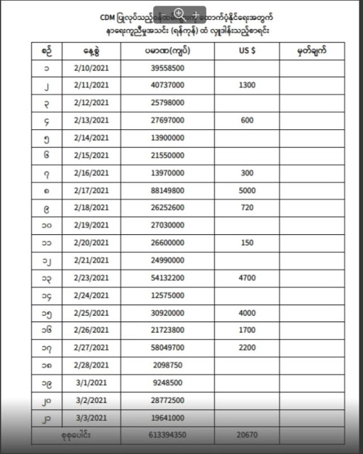 အဆိုပါ ငွေများအနက်မှ ပြည်နယ်နှင့်တိုင်းဒေသကြီး ၇ ခုရှိ CDM တွင် ပါဝင်လှုပ်ရှားနေသည့် ဝန်ထမ်းများထံသို့ အသင်းအဖွဲ့လူပုဂ္ဂိုလ်များတစ်ဆင့် မတ် ၂ ရက် အထိ CDM တွင် ပါဝင်လှုပ်ရှားနေသူ ဝန်ထမ်း ၂၀၀၈ ဦးခန့်အား တစ်ဦးလျှင် ၁ သိန်းကျပ်မှ ၂ သိန်းကျပ်ခန့်အထိ စုစုပေါင်းငွေကျပ် ၂၈၅၆၃၀၀၀၀ (သိန်းပေါင်း နှစ်ထောင့် ရှစ်ရာကျော်) ကို ထောက်ပံ့ပေးအပ်ခဲ့ကြောင်း၊ ၎င်းအပြင် ရန်ကုန်မြို့ရှိ ကွန်တိန်နာယာဉ်မောင်းများ၊ မီးရထား ဝန်ထမ်းများအား ထောက်ပံ့ပေးခြင်းများဖြင့် CDM ပြုလုပ်ရန် အားပေးအားမြှောက် လုပ်ဆောင်လျက်ရှိကြောင်း သိရှိရသည်။