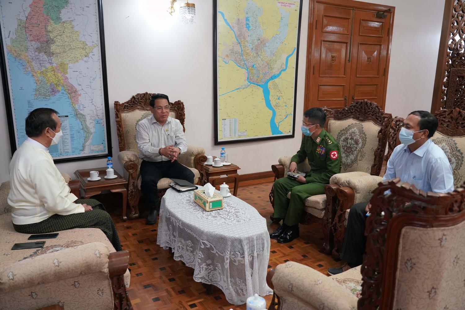 ဟိုတယ်နှင့်ခရီးသွားလာရေးဝန်ကြီးဌာန ပြည်ထောင်စုဝန်ကြီး ဦးမောင်မောင်အုန်း သည် မတ် ၁၈ ရက် မွန်းလွဲပိုင်းတွင် ရန်ကုန်တိုင်းဒေသကြီးအတွင်း ခရီးသွားလုပ်ငန်းများ ပြန်လည်ဖွံ့ဖြိုးတိုးတက်ရေး အတွက် ရန်ကုန်တိုင်းဒေသကြီးစီမံအုပ်ချုပ်ရေးကောင်စီဥက္ကဌ ဦးလှစိုးနှင့် တွေ့ဆုံသည်။