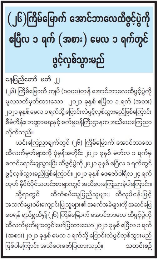(၂၆) ကြိမ်မြောက် အောင်ဘာလေထီဖွင့်ပွဲကို ဧပြီလ ၁ ရက် (အစား) မေလ ၁ ရက်တွင် ဖွင့်လှစ်သွားမည်