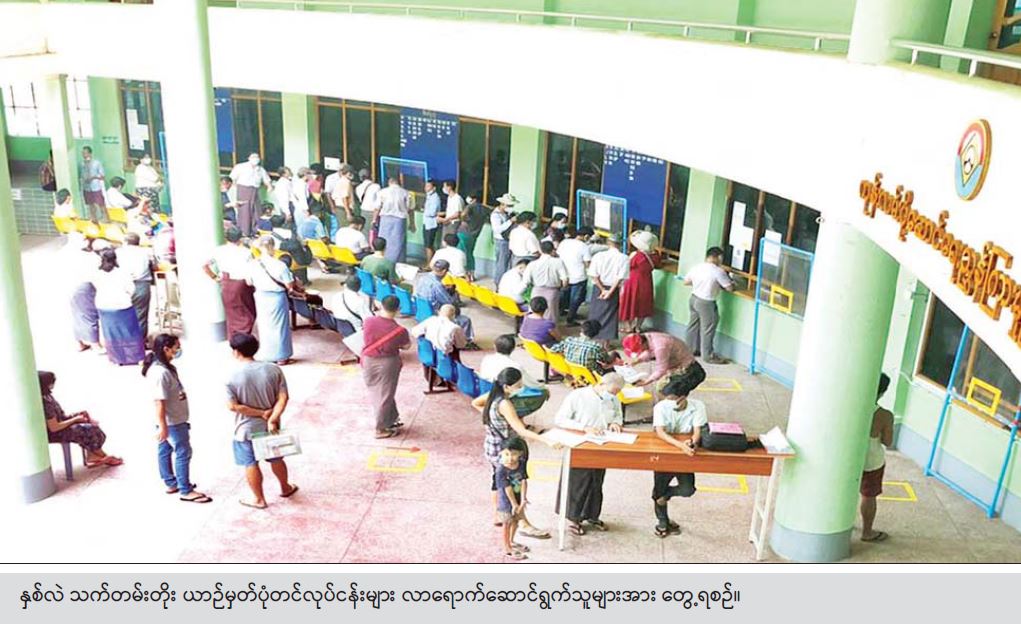 ယနေ့ လုပ်ငန်းဆောင်ရွက်မှုအနေဖြင့် စုစုပေါင်း သက်တမ်းတိုး မော်တော်ယာဉ်ပေါင်း (၁၃၁၄)စီး၊ သက်တမ်းတိုး မော်တော်ဆိုင်ကယ် (၂၂၃၀)၊ နယ်ဝင်/နယ်ထွက် ယာဉ်(၂၅၉)စီးနှင့် အမည်ပြောင်းယာဉ် (၃၁၅)စီး လာရောက်ဆောင်ရွက်ခဲ့ကြကြောင်း၊ ကညနအနေဖြင့် လုပ်ငန်းလာရောက်ဆောင်ရွက်သူ ပြည်သူများအား အဘက်ဘက်မှ အဆင်ပြေစွာ လက်ခံဆောင်ရွက်ပေးနိုင်ခဲ့ကြောင်း၊ COVD-19 ကြောင့် ဒုတိယအကြိမ်အဖြစ် လုပ်ငန်းရပ်ဆိုင်းထားခဲ့ရသည်မှာ (၆)လကျော် ကြာမြင့်ခဲ့ပြီဖြစ်သည့်အတွက် လုပ်ငန်း ကြွေးကျန်များကို အချိန်မီ လက်ခံဆောင်ရွက်ပေးသွားနိုင်ရန် ကြိုးပမ်းဆောင်ရွက်လျက် ရှိကြောင်း သိရသည်။