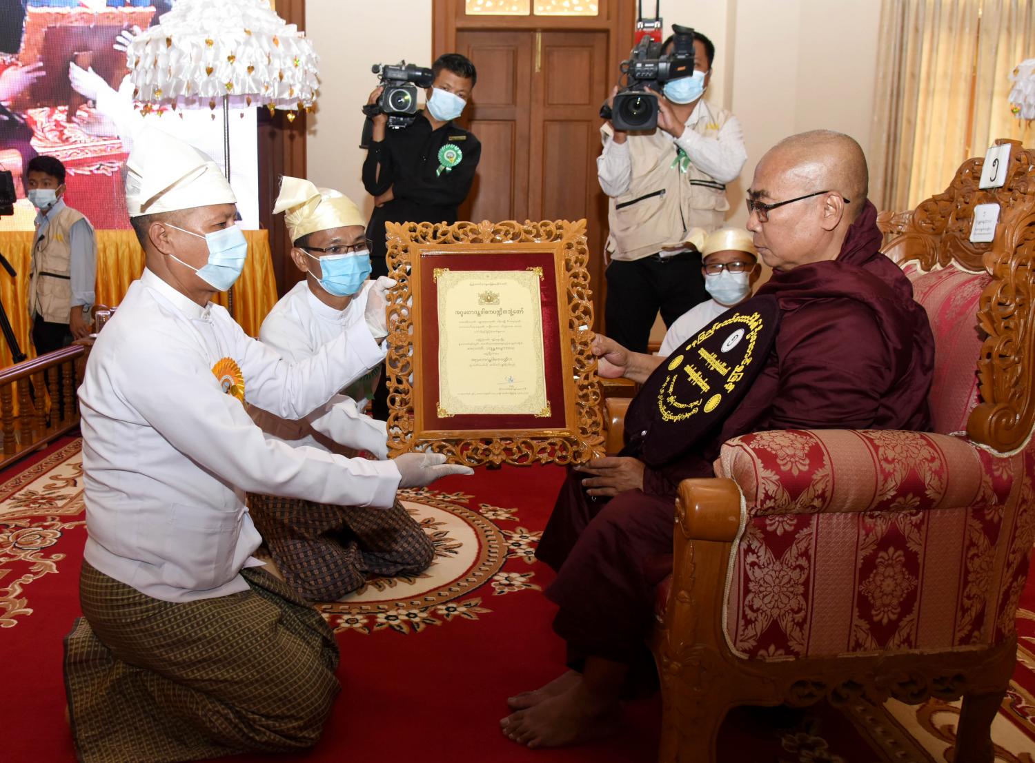 ယနေ့ကျင်းပသည့် နေပြည်တော်ကောင်စီနယ်မြေမှ ၂၀၂၁ ခုနှစ် သာသနာတော် ဆိုင်ရာ ဘွဲ့တံဆိပ်တော် ဆက်ကပ် ပူဇော်ပွဲ အခမ်းအနားတွင် အဂ္ဂမဟာပဏ္ဍိတ ဘွဲ့တံဆိပ် တော်ရ ဆရာတော် (၂)ပါး၊ အဂ္ဂမဟာသဒ္ဓမ္မဇောတိကဓဇ ဘွဲ့တံဆိပ်တော်ရ ဆရာတော် (၂)၊ အဂ္ဂမဟာ ဂန္ထဝါစကပဏ္ဍိတ ဘွဲ့တံဆိပ်တော်ရဆရာတော် (၃)ပါး၊ မဟာဂန္ထဝါစကပဏ္ဍိတ ဘွဲ့တံဆိပ် တော်ရဆရာတော် (၄)ပါး၊ မဟာသဒ္ဓမ္မဇောတိကဓဇ ဘွဲ့တံဆိပ်တော်ရ ဆရာတော် (၄)ပါး၊ မဟာကမ္မဋ္ဌာနာစရိယ ဘွဲ့တံဆိပ်တော်ရ ဆရာတော် (၁)ပါး၊ ဓမ္မကထိက ဗဟုဇနဟိတဓရ ဘွဲ့တံဆိပ်တော်ရ ဆရာတော် (၁) ပါး၊ ဂန္ထဝါစက ပဏ္ဍိတ ဘွဲ့တံဆိပ်တော်ရ ဆရာတော် (၇) ပါး၊ သဒ္ဓမ္မဇောတိကဓဇ ဘွဲ့တံဆိပ်တော်ရ ဆရာတော် (၅) ပါး၊ ဂန္ထဝါစက ပဏ္ဍိတ ဘွဲ့တံဆိပ်တော်ရ သီလရှင်ဆရာကြီး (၂) ပါးနှင့် မဟာသဒ္ဓမ္မဇောတိဥဓဇ ဘွဲ့တံဆိပ်တော်ရ လူပုဂ္ဂိုလ်(၂) ဦး တို့အား သာသနာတော်ဆိုင်ရာ ဘွဲ့တံဆိပ်များကို ဆက်ကပ်ပူဇော် ပေးအပ်ခဲ့ကြောင်း သိရသည်။