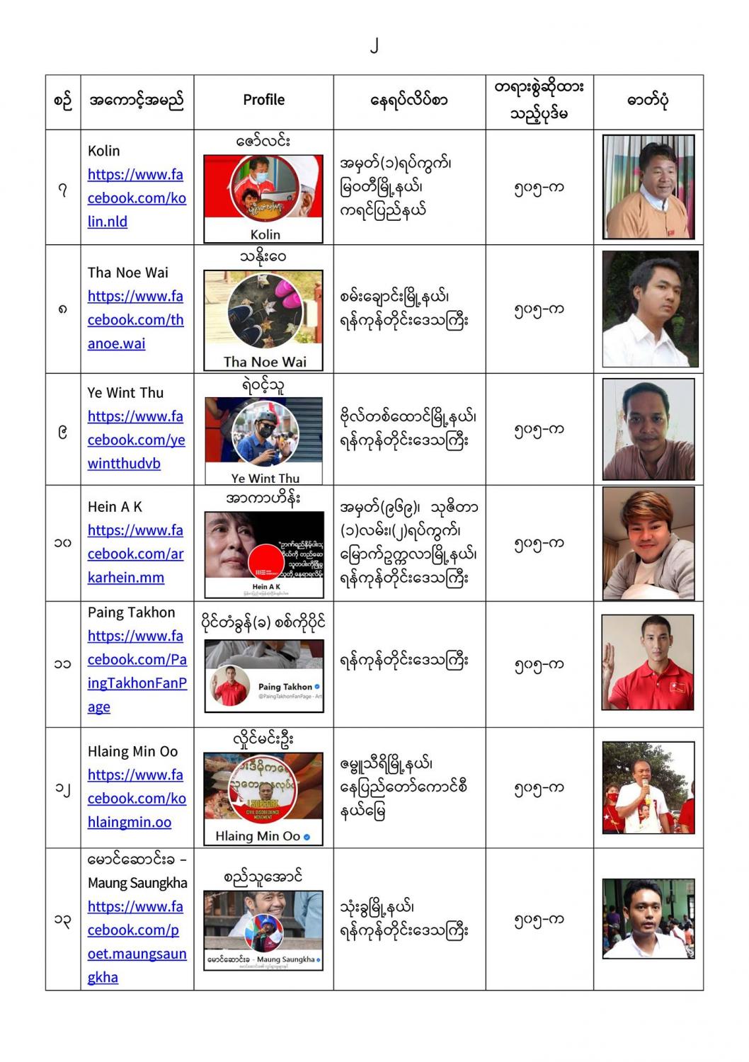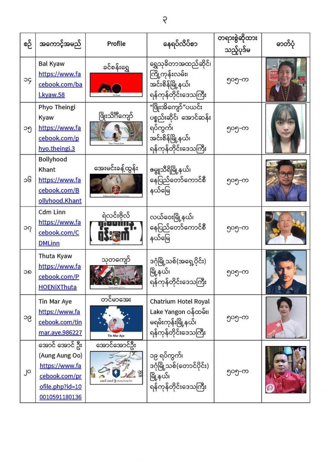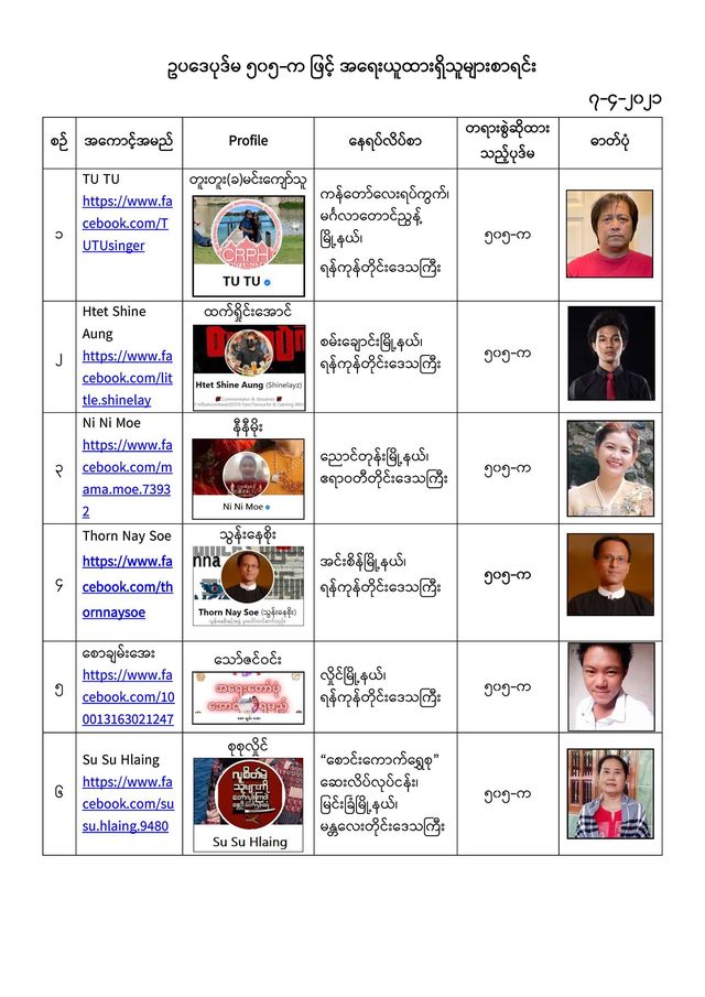 နိုင်ငံတော်၏ အုပ်ချုပ်မှုယန္တရားပျက်ပြားစေရန်ရည်ရွက်ချက်ဖြင့် နိုင်ငံ့ဝန်ထမ်းများအား CDM လှုပ်ရှားမှုတွင် ပါဝင်စေရန်လှုံ့ဆော်ခြင်း၊ CRPH မတရားအသင်းအား ထောက်ခံသည့် အကြောင်းအရာများ၊ မမှန်သတင်းများအား ဖြန့်ဝေခြင်း၊ နိုင်ငံတော်တည်ငြိမ်အေးချမ်းမှုကို ပျက်ပြားစေပြီး ဆူပူအုံကြွမှုဖြစ်ပေါ်စေရန်နှင့် အများပြည်သူ အထိတ်တလန့်ဖြစ်စေရန် အတွက် သွေးထိုးလှုံ့ဆော်မှုများ ပြုလုပ်ခြင်း၊ Social Punishment ပြုလုပ်ခြင်းများကို လူမှုကွန်ရက် စာမျက်နှာများတွင် ရည်ရွယ်ချက်ရှိရှိ ဖြင့်ဖော်ပြခြင်းနှင့် ဖြန့်ဝေခြင်းများ ဆောင်ရွက် လျက်ရှိသည့် အောက်ဖော်ပြပါ အနုပညာရှင်အချို့နှင့် အခြားပါဝင်ပတ်သက်သူများအား ရာဇသတ်ကြီးပုဒ်မ ၅၀၅-က ဖြင့် အမှုဖွင့်အရေးယူ ဆောင်ရွက်လျက်ရှိသည်။