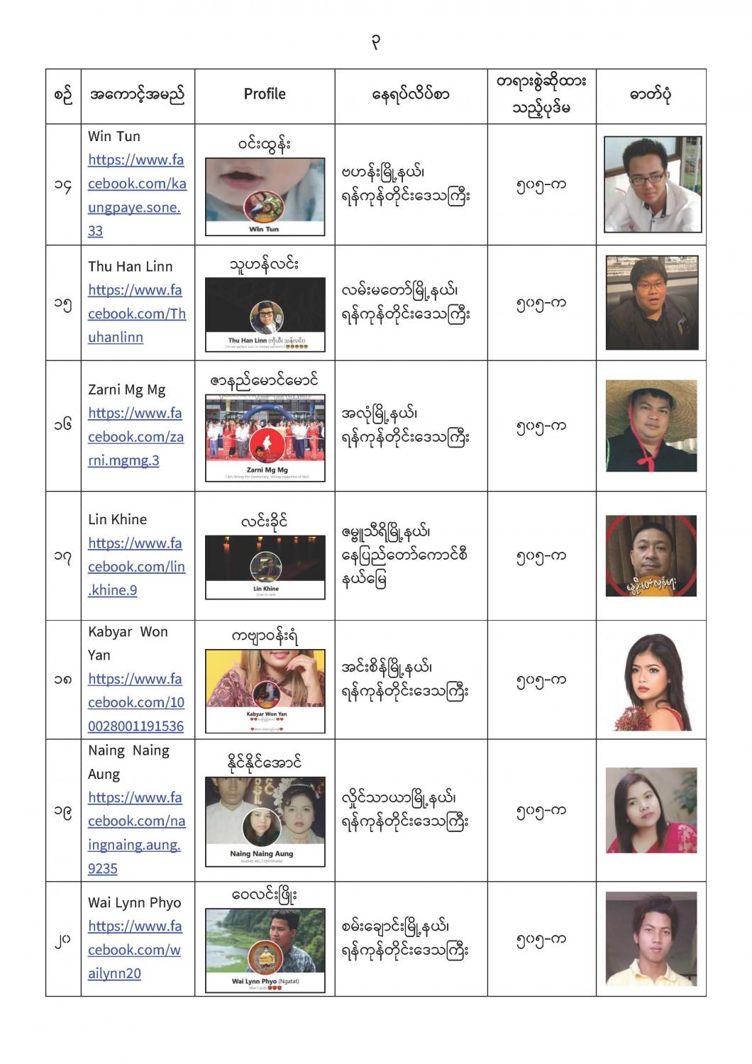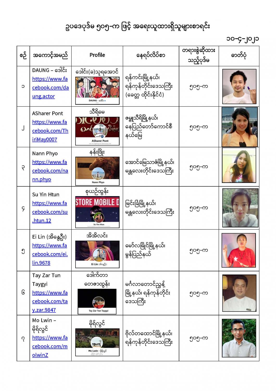 နိုင်ငံတော်၏ အုပ်ချုပ်မှုယန္တရားပျက်ပြားစေရန်ရည်ရွက်ချက်ဖြင့် နိုင်ငံ့ဝန်ထမ်းများအား CDM လှုပ်ရှားမှုတွင် ပါဝင်စေရန်လှုံ့ဆော်ခြင်း၊ CRPH မတရားအသင်းအား ထောက်ခံသည့် အကြောင်းအရာများ၊ မမှန်သတင်းများအားဖြန့်ဝေခြင်း၊ နိုင်ငံတော်တည်ငြိမ်အေးချမ်းမှုကို ပျက်ပြားစေပြီး ဆူပူအုံကြွမှုဖြစ်ပေါ်စေရန်နှင့် အများပြည်သူအထိတ်တလန့်ဖြစ်စေရန် အတွက် သွေးထိုးလှုံ့ဆော်မှုများပြုလုပ်ခြင်း၊ Social Pumishment ပြုလုပ်ခြင်းများကို လူမှုကွန်ရက် စာမျက်နှာများတွင် ရည်ရွယ်ချက်ရှိရှိ ဖြင့်ဖော်ပြခြင်းနှင့် ဖြန့်ဝေခြင်းများ ဆောင်ရွက် လျက်ရှိသည့် အောက်ဖော်ပြပါ အနုပညာရှင်အချို့နှင့် အခြားပါဝင်ပတ်သက်သူများအား ရာဇသတ်ကြီးပုဒ်မ ၅၀၅-က ဖြင့် အမှုဖွင့်အရေးယူ ဆောင်ရွက်လျက်ရှိပါသည်။ သတင်းစဉ်