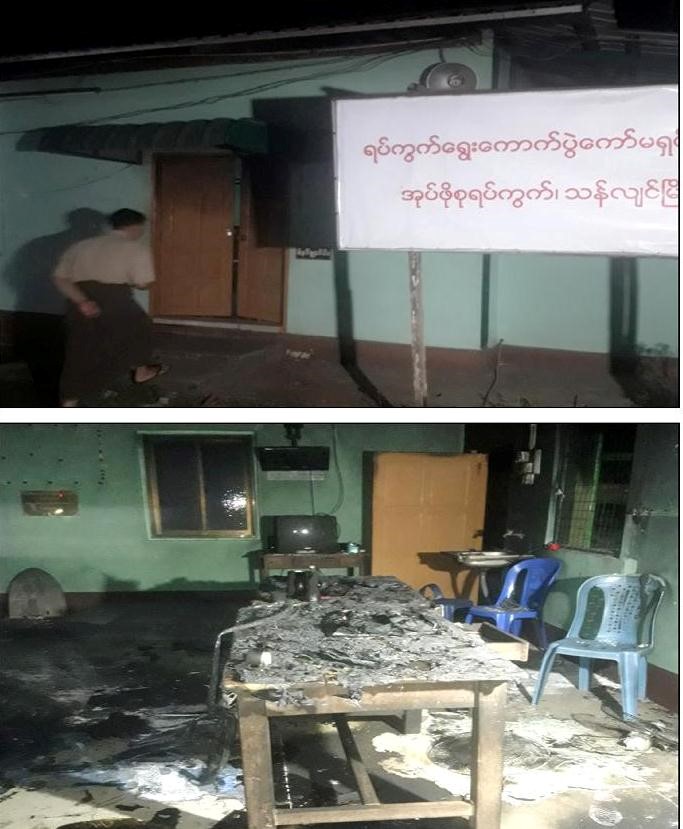 အလားတူ နံနက် ၄ နာရီအချိန်တွင် သန်လျင်မြို့နယ်၊ အုတ်ဖိုစုရပ်ကွက်၊ ရပ်ကွက်စီမံအုပ် ချုပ်ရေးအဖွဲ့ရုံး မီးလောင်နေကြောင်း သတင်းအရ လုံခြုံရေးတပ်ဖွဲ့ဝင်များနှင့် မီးသတ်တပ်ဖွဲ့ဝင်များ မှ သွားရောက်မီးငြှိမ်းသတ်ခဲ့ရာ နံနက် ၄ နာရီ ၂၀ အချိန်တွင် မီးငြိမ်းသွားခဲ့ပြီး မီးလောင်မှုကြောင့် ရုံးခန်းအတွင်းရှိ ပန်ကာ ၂ လုံး၊ TV ၂ လုံး၊ Sound Box ၂ လုံး၊ ပလက်စတစ်ထိုင်ခုံ ၇ လုံးနှင့် အခြားရုံးအသုံးအဆောင်ပစ္စည်းများ မီးလောင်ဆုံးရှုံးခဲ့ပြီး လုံခြုံရေးတပ်ဖွဲ့ဝင်များက မီးလောင်မှုနှင့်ပတ်သက်၍ စိစစ်ခဲ့ရာ အကြမ်းဖက်သူများမှ ရုံးအတွင်းဒီဇယ်လောင်း၍ မီးရှို့ခဲ့ခြင်း ဖြစ်ကြောင်း သိရသည်။