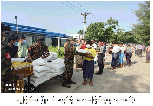 COVID-19 ရောဂါ ကာကွယ်၊ ထိန်းချုပ်ကုသရေးလုပ်ငန်းများဆောင်ရွက် နေ့စဉ် ကာလအတွင်း သွားလာမှုကန့်သတ်ချက်များကြောင့် ဒေသခံပြည်သူများ စားရေး အဆင်ပြေစေရန်အတွက် နယ်မြေခံတပ်မတော်သားများက ဆန်၊ ဆီနှင့် စားသောက် ဖွယ်ရာများကို အိမ်အရောက် လိုက်လံပေးဝေလှူဒါန်းလျက်ရှိသည်။