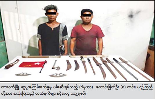 သိမ်းဆည်းရမိ ထိုသို့ ဆောင်ရွက်ခဲ့ရာ ဧပြီ ၁၉ ရက် နံနက် ၉ နာရီခွဲတွင် လှိုင်မြို့နယ် အမှတ်(၁၂)ရပ်ကွက် လှိုင် တက္ကသိုလ်ဝင်းအတွင်းရှိ “ဇွဲကပင်” အဆင်အတွင်း မှ ဧရာဝတီတိုင်းဒေသကြီး မြန်အောင်မြို့နယ် သပြေကုန်းကျေးရွာနေ မျိုးမြတ်ဇော်(၂)နှစ် (ဘ) ဦးဝင်းမောင်ပါ အမျိုးသား နှစ်ဦးအား လေးခွ တစ်လက်၊ ဓာတ်ငွေ့ကာ နှစ်ခု၊ ဖိုက်ဘာဦးထုပ် ငါးလုံး၊ ဆူပူအကြမ်းဖက်မှုတွင် အသုံးပြုသည့် ပစ္စည်းများဖြင့် လည်းကောင်း၊ နံနက် ၁၀ နာရီတွင် မန္တလေးတိုင်းဒေသကြီး ရမည်းသင်းမြို့နယ် လက်ဆည်ကန်ကျေးရွာ ရန်ကုန်-မန္တလေး လမ်းဟောင်းဘေးနေ သိန်းဇော် (၃၆)နှစ် (ဘ) ဦးမြင့်သိန်း၏ “ဇော်”ကားက်မှတ်အရောင်းဆိုင်မှ သိန်းဇော်အား ဓာတ်ဆီ တစ်ဘူး၊ မီးကွင်း လေးခု၊ နိုင်ငံတော်ဆန့်ကျင်ရေးစာသားများ ရေးသားထား သည့်ဗီနိုင်း တစ်ခုဖြင့်လည်းကောင်း၊ ပဲခူးတိုင်းဒေသ ကြီး မိုးညိုမြို့နယ်ရွှေသောင်ကျေးရွာနေ သန်းအောင် စိုး (၅၅)နှစ် (ဘ) ဦးစံဖြူ အား ဂျင်ကလိ ၁၄ ချောင်း၊ ဓားမြှောင် တစ်ချောင်း၊ လှံတစ်ချောင်း၊ မှိန်း သုံးချောင်း၊ သေနတ်ပုံသစ်သားကိုယ်ထည် တစ်ခု၊ သတ္တုပြောင်း ခြောက်ခု UECရွေးကောက်ပွဲ ဆန္ဒပြု တံဆိပ်တုံး တစ်ခု၊ ဆူပူဆန္ဒပြရာတွင် အသုံးပြုသည့် အခြားဆက်စပ်ပစ္စည်းများဖြင့် လည်းကောင်း နံနက် ၁ နာရီ မိနစ် ၄၀ တွင်လုံခြုံရေးတပ်ဖွဲ့ဝင်များသည် ဂုံမြို့သစ်(တောင်ပိုင်း)မြို့နယ် အမှတ်(၂၃)ရပ်ကွက် မိုးကုတ်လမ်း ကမာကြည်တံတားအဆင်း၌ ယဉ် များ အား စစ်ဆေး ဆောင်ရွက်နေစဉ် သာကေတ မြို့နယ်ဘက်မှ ဂုံမြို့သစ်(တောင်ပိုင်း)မြို့နယ်ဘက် သို့ ဒဂုံမြို့ (ဆိပ်ကမ်း)မြို့နယ်နေ ပြည့်စုံ(၂ဝ)နှစ် (ဘ) ဦးမြင့်ဦး မောင်းနှင်ပြီး ဒဂုံမြို့သစ် (တောင်ပိုင်း) မြို့နယ် (၂၁)ရပ်ကွက်နေ သိန်းစိုး (၂ဝ)နှစ် (ဘ) ဦးတင်မောင် လိုက်ပါလာသော ဆိုင်ကယ်အား ရပ်တန့်စစ်ဆေးရာ ပြည့်စုံ၏ပုဆိုးခါးပိုက်အတွင်းမှ ယမ်းကြိုး ဆု ချောင်း၊ ယမ်းမီးခြစ်ဘူး ငါးဘူးအား သိမ်းဆည်းရမိခဲ့ပြီး ဆက်စပ်ဖော်ထုတ်ချက်အရ သင်္ဃန်းကျွန်းမြို့နယ်နေ နွေဦး(စိစစ်ဆဲ)၏ နေအိမ် အား သွားရောက်ရှာဖွေခဲ့ရာ နေအိမ်အတွင်းမှ လက်လုပ်သေနတ် တစ်လက်၊ ဓား တစ်ချောင်း၊ ယမ်းကြိုး အချောင်း ၁၁၀ ၊ စတီးဘောစေ့ ၉၄ လုံး၊ လေးခွ နှစ်လက်ဆော်ဆီတစ်ဂါလန်ဖိုက်ဘာဦးထုပ် နှစ်လုံး၊ ဓာတ်ငွေ့ကာတစ်ခုနှင့် အခြားဆက်စပ် ပစ္စည်းများဖြင့် လည်းကောင်း၊ မွန်းလွဲ ၁ နာရီတွင် ရန်ကုန်တိုင်းဒေသကြီး သုံးခွမြို့မရဲစခန်းမှ ၅၀၅-က အမှုဖြင့် အမှုဖွင့်လှစ်ခံထားရပြီး တိမ်းရှောင်နေသူ သုံးခွမြို့ အမှတ်(၇)ရပ်ကွက်နေ ကိုကိုဇင်လင်း (၃၃) နှစ် (ဘ)ဦးခင်မောင်သည် သုံးခွမြို့နယ် အမှတ်(၅) ရပ်ကွက်ရှိ မဟာစည်သာသနာ့ရိပ်သာသို့ ရောက်ရှိ နေကြောင်း သတင်းအရ သွားရောက်ဖမ်းဆီးခဲ့