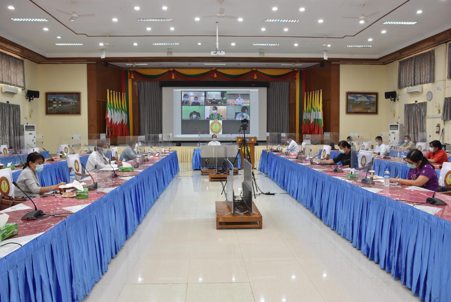 ကိုဗစ်-၁၉ ရောဂါကာကွယ်ထိန်းချုပ်ရေး လုပ်ငန်းညှိနှိုင်းအစည်းအဝေးကို ယနေ့နံနက်ပိုင်းတွင် ကျန်းမာရေးနှင့်အားကစားဝန်ကြီးဌာန ရုံးအမှတ် (၄) အစည်းအဝေးခန်းမ၌ ဗီဒီယိုကွန်ဖရင့် စနစ်ဖြင့် ကျင်းပသည်။