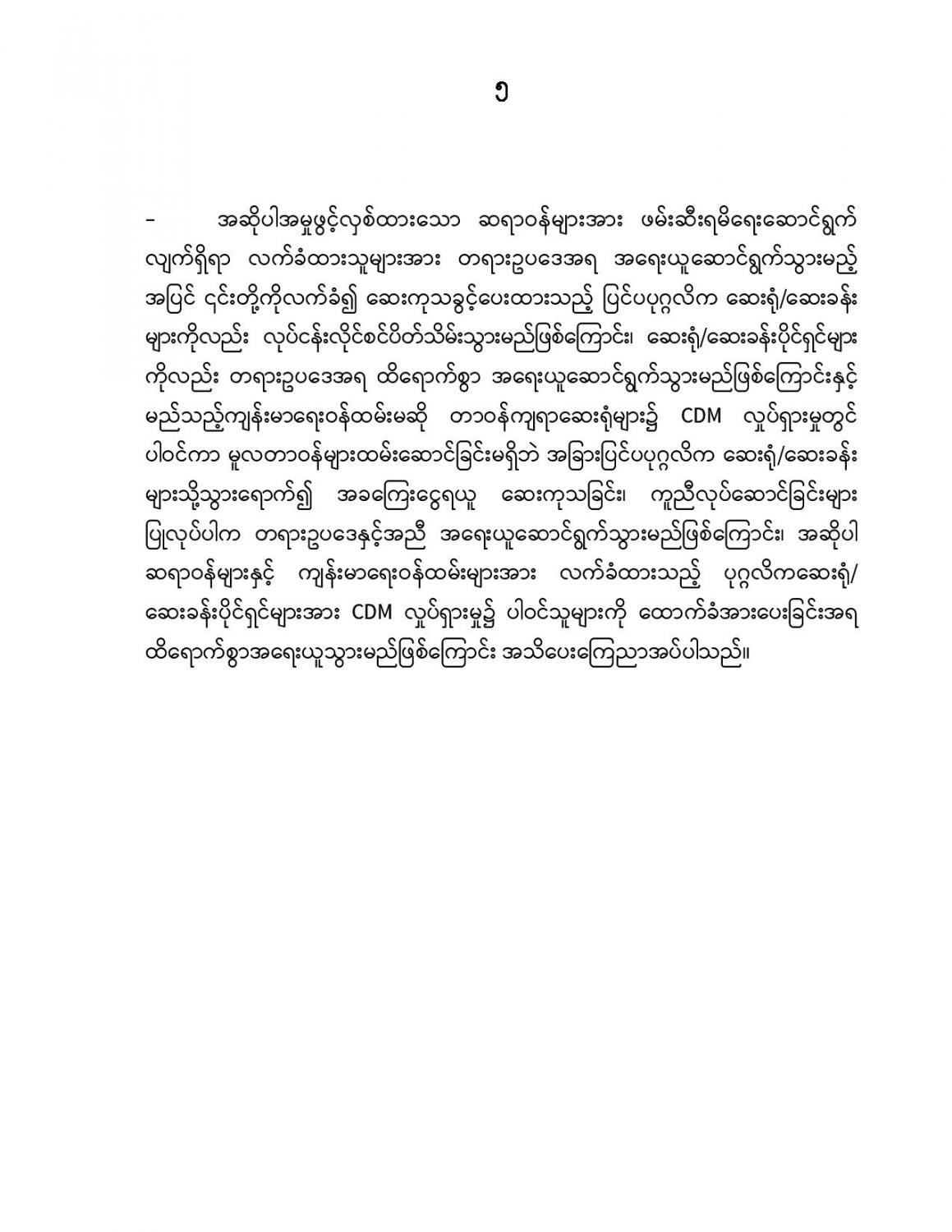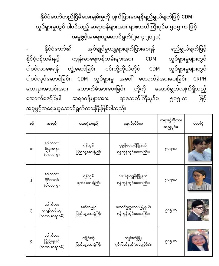 နိုင်ငံတော်တည်ငြိမ်အေးချမ်းမှုကို ပျက်ပြားစေရန်ရည်ရွယ်ချက်ဖြင့် CDM လှုပ်ရှားမှုတွင် ပါဝင်သည့် ဆရာဝန်များအား ရာဇသတ်ကြီးပုဒ်မ ၅၀၅-က ဖြင့် အမှုဖွင့်အရေးယူဆောင်ရွက် (၂၈-၄-၂၀၂၁)