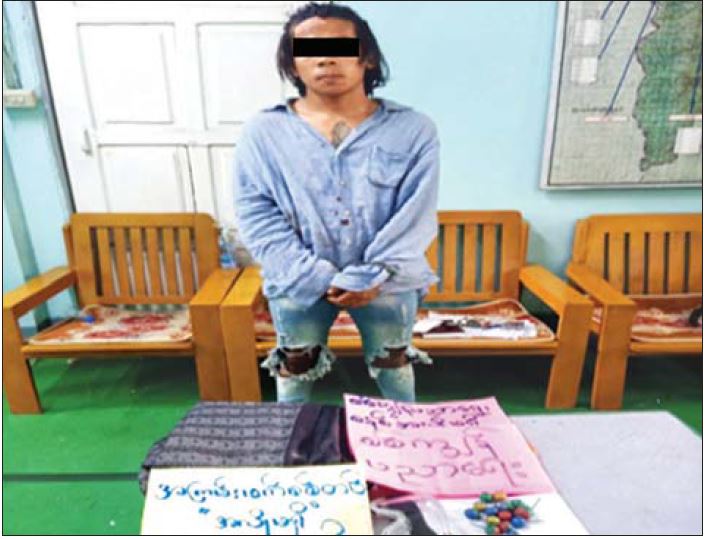 ထိုသို့ဆောင်ရွက်ခဲ့ရာ ၂၀၂၁ ခုနှစ်၊ ဧပြီလ ၂၇ ရက်နေ့ ညနေ ၄ နာရီအချိန်တွင် ကရင်ပြည်နယ်၊ မြဝတီမြို့၊ အမှတ်(၅)ရပ်ကွက်၊ ဆင်းရွှေလီ(၄)လမ်းမပေါ်၌ အမျိုးသား ၅ ဦး ဆူပူဆန္ဒပြနေကြောင်း သတင်းအရ လုံခြုံရေးတပ်ဖွဲ့ဝင်များက သွားရောက်စစ်ဆေးရာ အမှတ်(၁)ရပ်ကွက်နေ အောင်ဖြိုးဦး(ခ) အန်းကုန်း(၁၉)နှစ် (ဘ)ဦးထွန်းနိုင် အား နိုင်ငံတော်ဆန့်ကျင်ရေး လှုံ့ဆော်စာသားများပါ A-4 စာရွက်များ၊ ဆိုင်းဘုတ်များနှင့်အတူ တွေ့ရှိရသဖြင့် ဖမ်းဆီးထိန်းသိမ်းခဲ့ပါသည်။