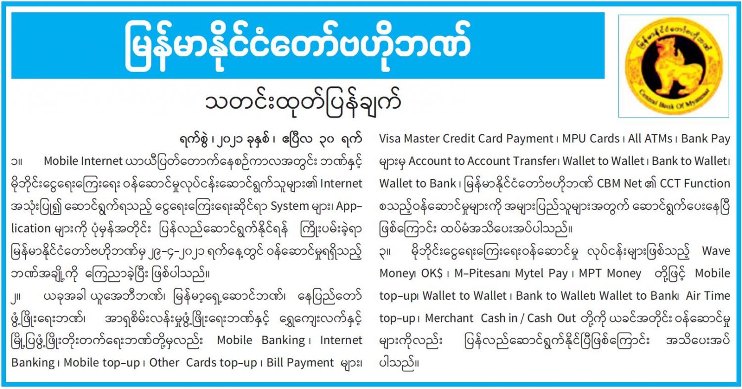 မြန်မာနိုင်ငံတော်ဗဟိုဘဏ် သတင်းထုတ်ပြန်ချက်