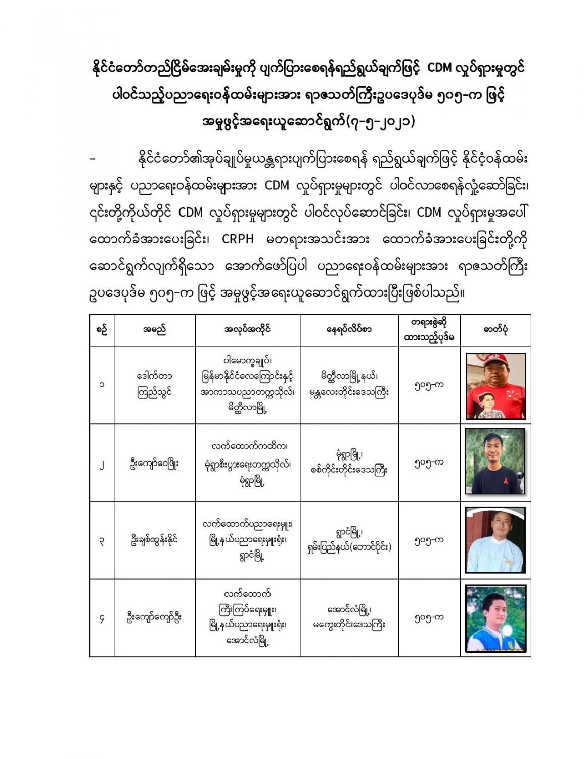 နိုင်ငံတော်တည်ငြိမ်အေးချမ်းမှုကို ပျက်ပြားစေရန်ရည်ရွယ်ချက်ဖြင့် CDM လှုပ်ရှားမှုတွင် ပါဝင်သည့်ပညာရေးဝန်ထမ်းများအား ရာဇသတ်ကြီးဥပဒေပုဒ်မ ၅၀၅-က ဖြင့် အမှုဖွင့် အရေးယူဆောင်ရွက်(၇-၅-၂၀၂၁)