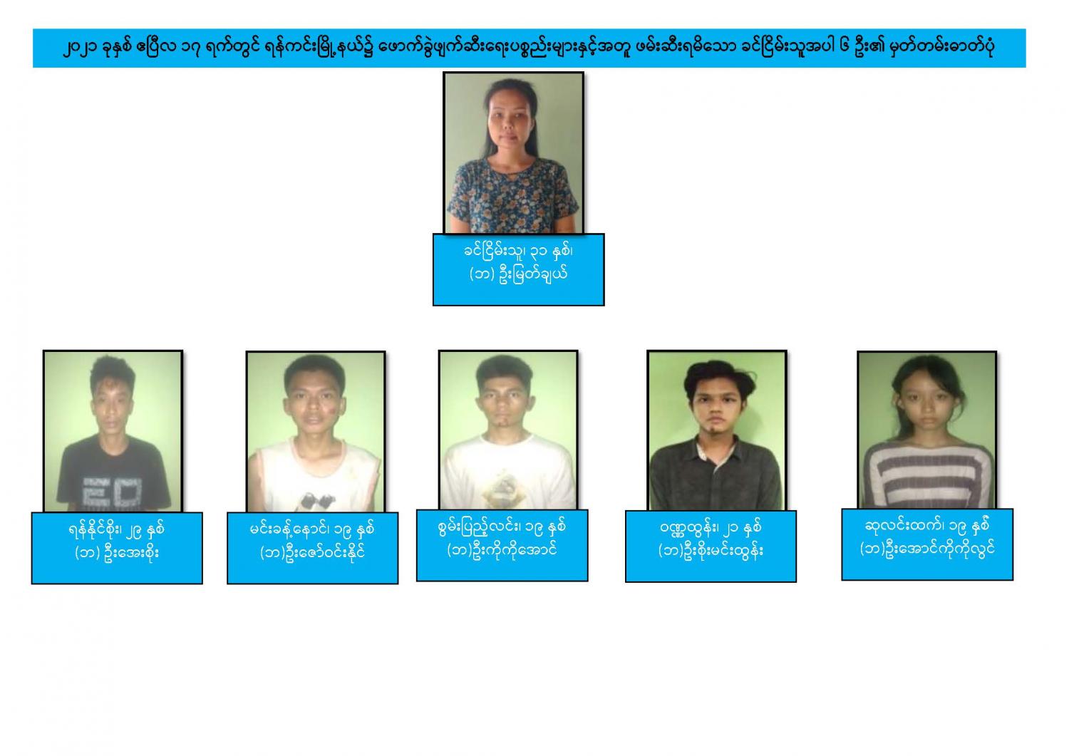 ထိုသို့ဆောင်ရွက်လျက်ရှိရာ ဧပြီ ၁၇ ရက်တွင် ရန်ကုန်တိုင်းဒေသကြီး၊ ရန်ကင်းမြို့နယ် ၌ ဖောက်ခွဲရေးလုပ်ငန်းများဆောင်ရွက်ရန်နှင့် တိုင်းရင်းသားလက်နက် ကိုင်အဖွဲ့ အစည်းများထံတွင် သင်တန်းတက်ရောက်ရန် စီစဉ်နေကြောင်း သတင်းအရ လုံခြုံရေးတပ်ဖွဲ့ဝင်များက ရန်ကင်းမြို့နယ်၊ အမှတ်(၄)ရပ်ကွက်၊ ရန်နိုင်လမ်းသွယ် (၁၆)၊ တိုက်အမှတ်(၃၃)၊ အခန်းအမှတ်(၁၈)နေ ခင်ငြိမ်းသူ၏နေအိမ်ကို ဝင်ရောက်ရှာ ဖွေရာ ခင်ငြိမ်းသူ၊ ၃၁ နှစ်၊ (ဘ)ဦးမြတ်ချယ်၊ ရန်နိုင်စိုး၊ ၂၉ နှစ်၊ (ဘ) ဦးအေးစိုး၊ မင်းခန့်နောင်၊ ၁၉ နှစ်၊ (ဘ)ဦးဇော်ဝင်းနိုင်၊ စွမ်းပြည့်လင်း၊ ၁၉ နှစ်၊ (ဘ) ဦးကိုကိုအောင်၊ ဝဏ္ဏထွန်း၊ ၂၁ နှစ် (ဘ)ဦးစိုးမင်းထွန်းနှင့် ဆုလင်းထက်၊ ၁၉ နှစ်၊ (ဘ) ဦးအောင်ကိုကိုလွင်တို့ ၆ ဦးအား လက်လုပ်မိုင်း ၄၈ လုံး၊ ယမ်းပျော့ ၂၀ တောင့်၊ ဒီတိုနေတာ ၂၀ ခု၊ ယမ်းကြိုး ၁၀ ပေ အပါအဝင် အကြမ်းဖက်ရာတွင် အသုံးပြုသည့် ပစ္စည်းများနှင့်အတူ ဖမ်းဆီးရမိခဲ့သည်။