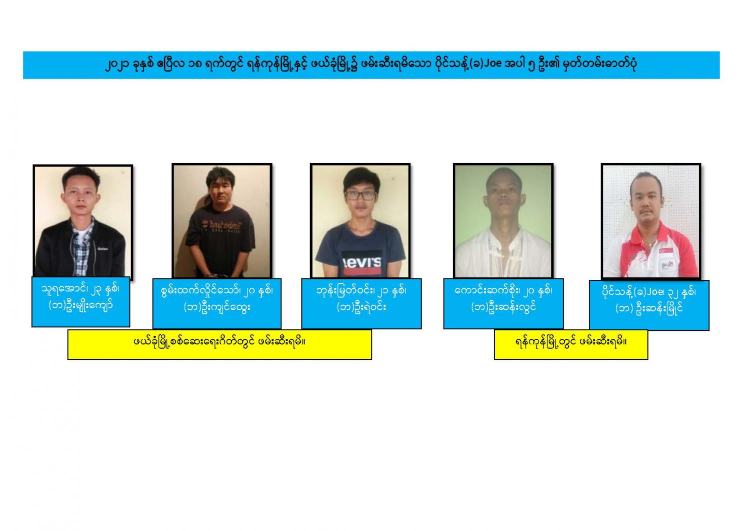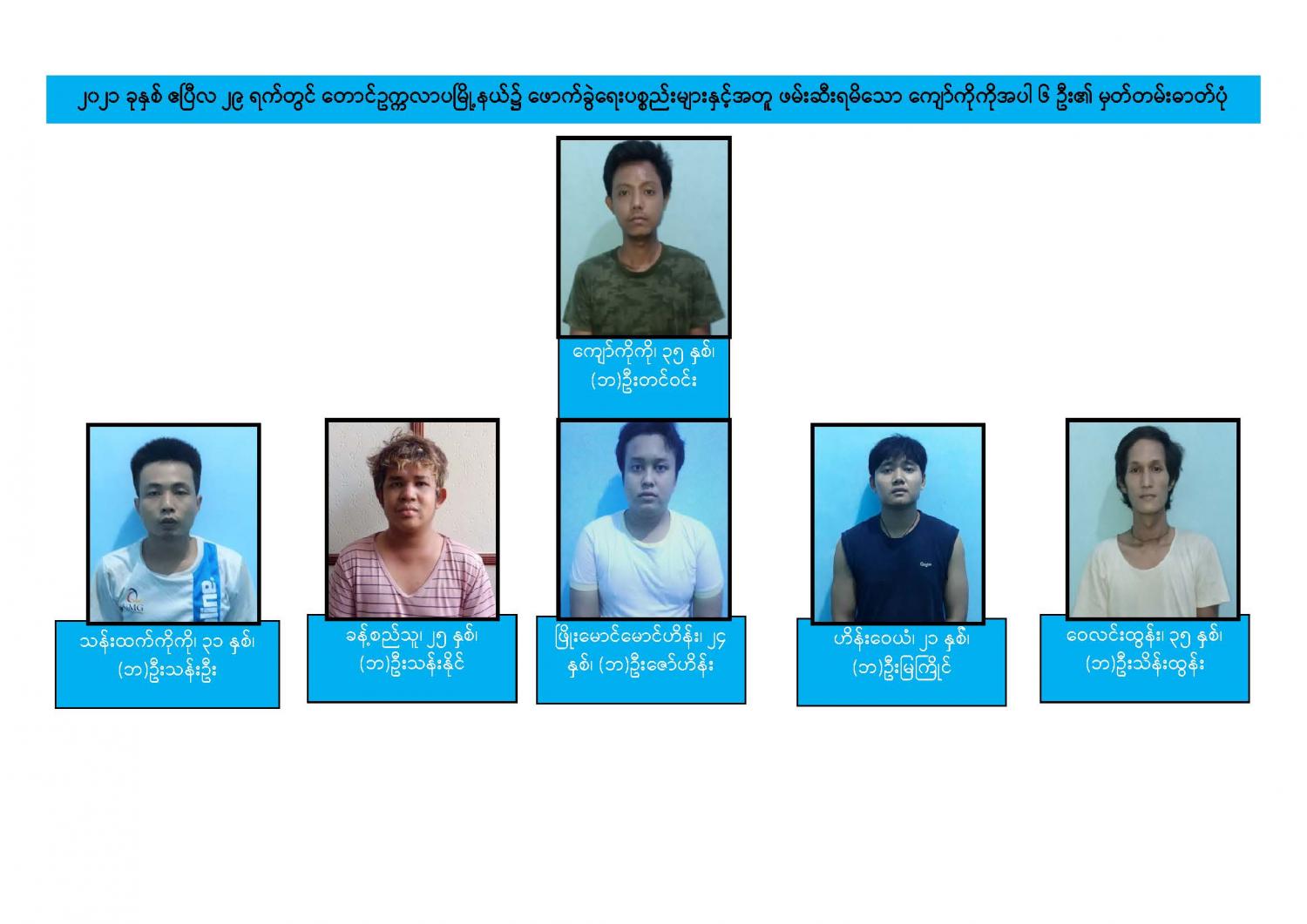 ထို့ပြင် မေ ၁ ရက်တွင် စိုးကိုကို၊ ၂၅ နှစ်၊ (ဘ)ဦးအေးကို အား သင်္ဃန်းကျွန်းမြို့နယ်၊ လေးထောင့်ကန်လမ်းမကြီးပေါ်၌ လည်းကောင်း၊ မေ ၂ ရက်တွင် နေလင်းထွန်း(ခ)အရှည်ကြီး၊ ၂၆ နှစ်၊ (ဘ)ဦးစောလှိုင် ကို တောင်ဥက္ကလာပ မြို့နယ်၊ နန္နဝန်ဈေးအနီး၌လည်းကောင်း၊ မေ ၆ ရက်တွင် ဖြိုးဝေဝင်း(ခ)ဘကြီးဖြိုး၊ ၄၃ နှစ်၊ (ဘ)ဦးဝင်းကြည်နှင့် အောင်သူဖြိုး၊ ၂၇ နှစ်၊ (ဘ)ဦးလှဌေးတို့ ၂ ဦးကို တောင်ဥက္ကလာပ မြို့နယ်၊ သုမင်္ဂလာလမ်းနှင့် အင်းဝလမ်းထောင့်ရှိ ပြည့်ချမ်းခေတ် လက်ဖက်ရည်ဆိုင်၌ လည်းကောင်း ဖမ်းဆီးရမိခဲ့သည်။