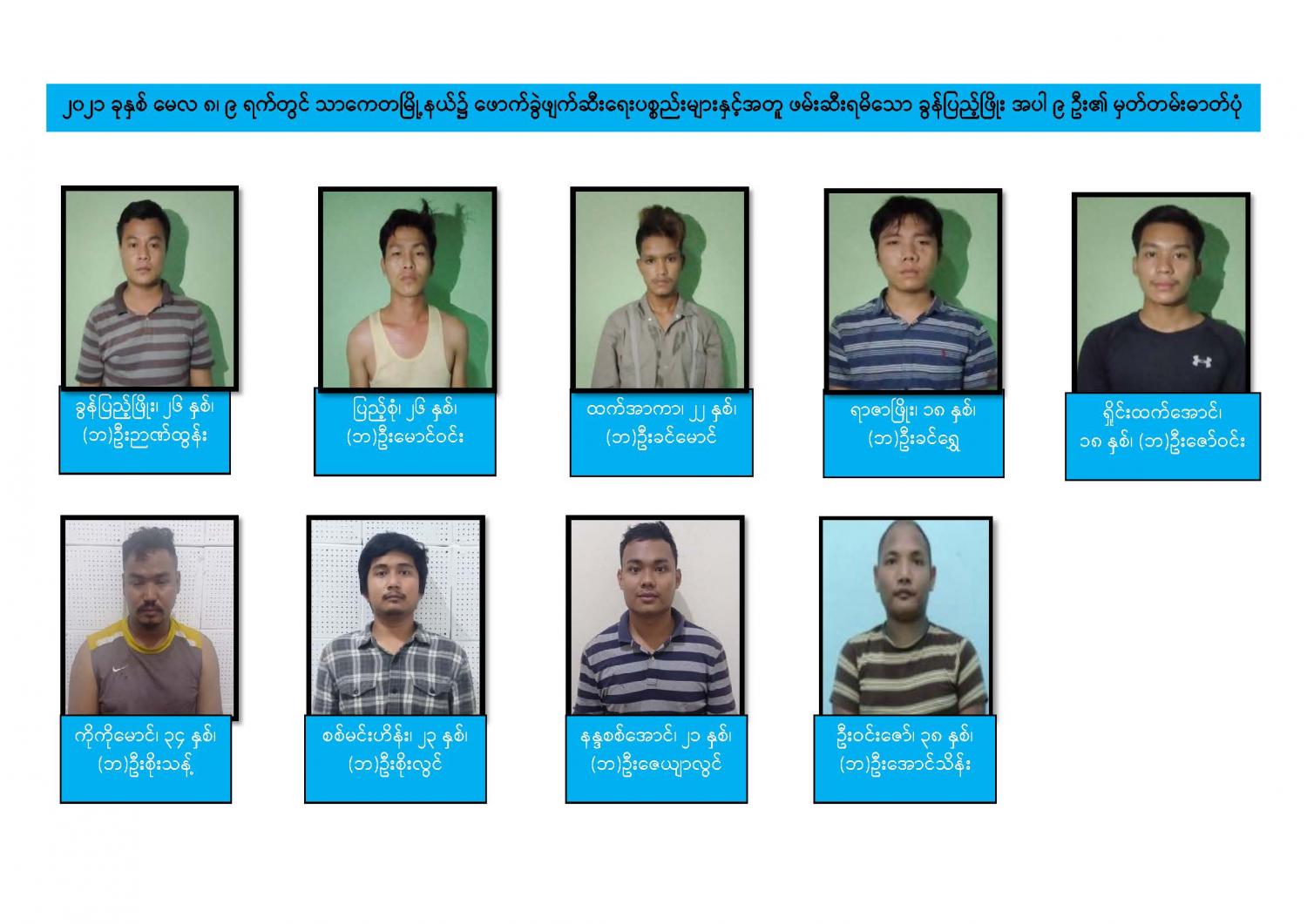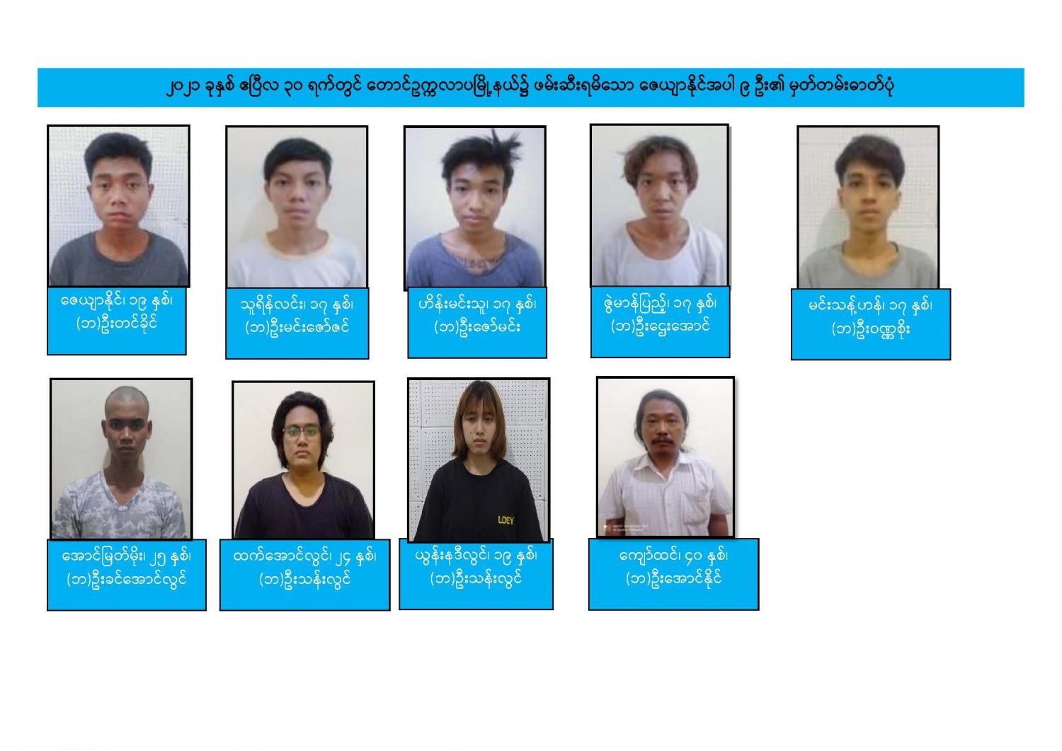 သတင်းဆက်အား ဆက်လက်ဖော်ထုတ်ခဲ့ရာ ဧပြီ ၃၀ ရက်တွင် တောင်ဥက္ကလာ ပမြို့နယ်အတွင်းနေထိုင်သူ ဇေယျာနိုင်၊ ၁၉ နှစ်၊ (ဘ)ဦးတင်ခိုင်၊ သူရိန်လင်း၊ ၁၇ နှစ်၊ (ဘ)ဦးမင်းဇော်ဇင်၊ ဟိန်းမင်းသူ၊ ၁၇ နှစ်၊ (ဘ)ဦးဇော်မင်း၊ ဇွဲမာန်ပြည့်၊ ၁၇ နှစ်၊ (ဘ)ဦးဌေးအောင်၊ မင်းသန့်ဟန်၊ ၁၇ နှစ်၊ (ဘ)ဦးဝဏ္ဏစိုး၊ အောင်မြတ်မိုး၊ ၂၅ နှစ်၊ (ဘ)ဦးခင်အောင်လွင်၊ ထက်အောင်လွင်၊ ၂၄ နှစ်၊ (ဘ)ဦးသန်းလွင်၊ ယွန်းနဒီလွင်၊ ၁၉ နှစ်၊ (ဘ)ဦးသန်းလွင်နှင့် ကျော်ထင်၊ ၄၀ နှစ်၊ (ဘ)ဦးအောင်နိုင်တို့ကို ၎င်းတို့၏ နေအိမ်အသီးသီး၌ ဖမ်းဆီးရမိခဲ့သည်။