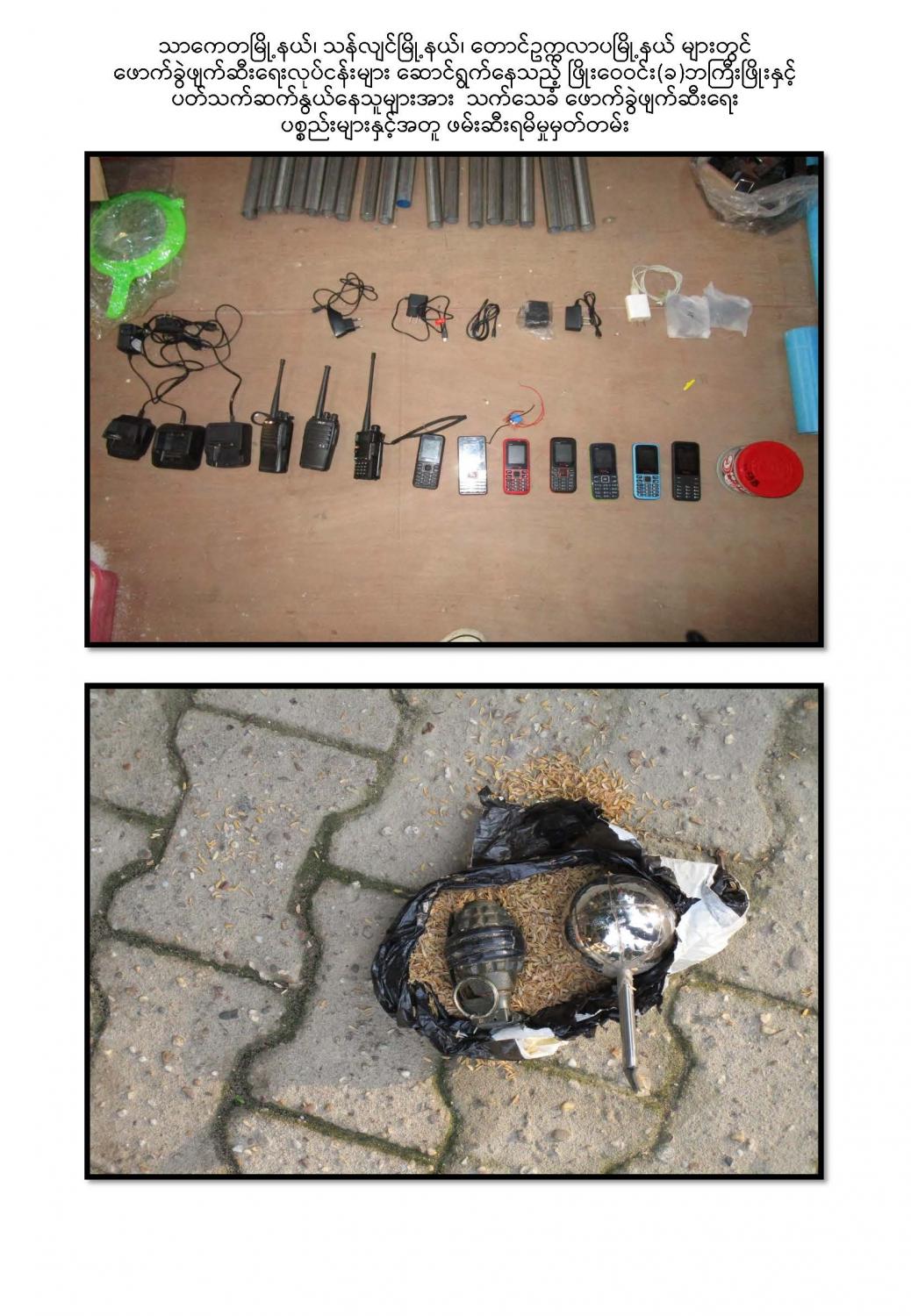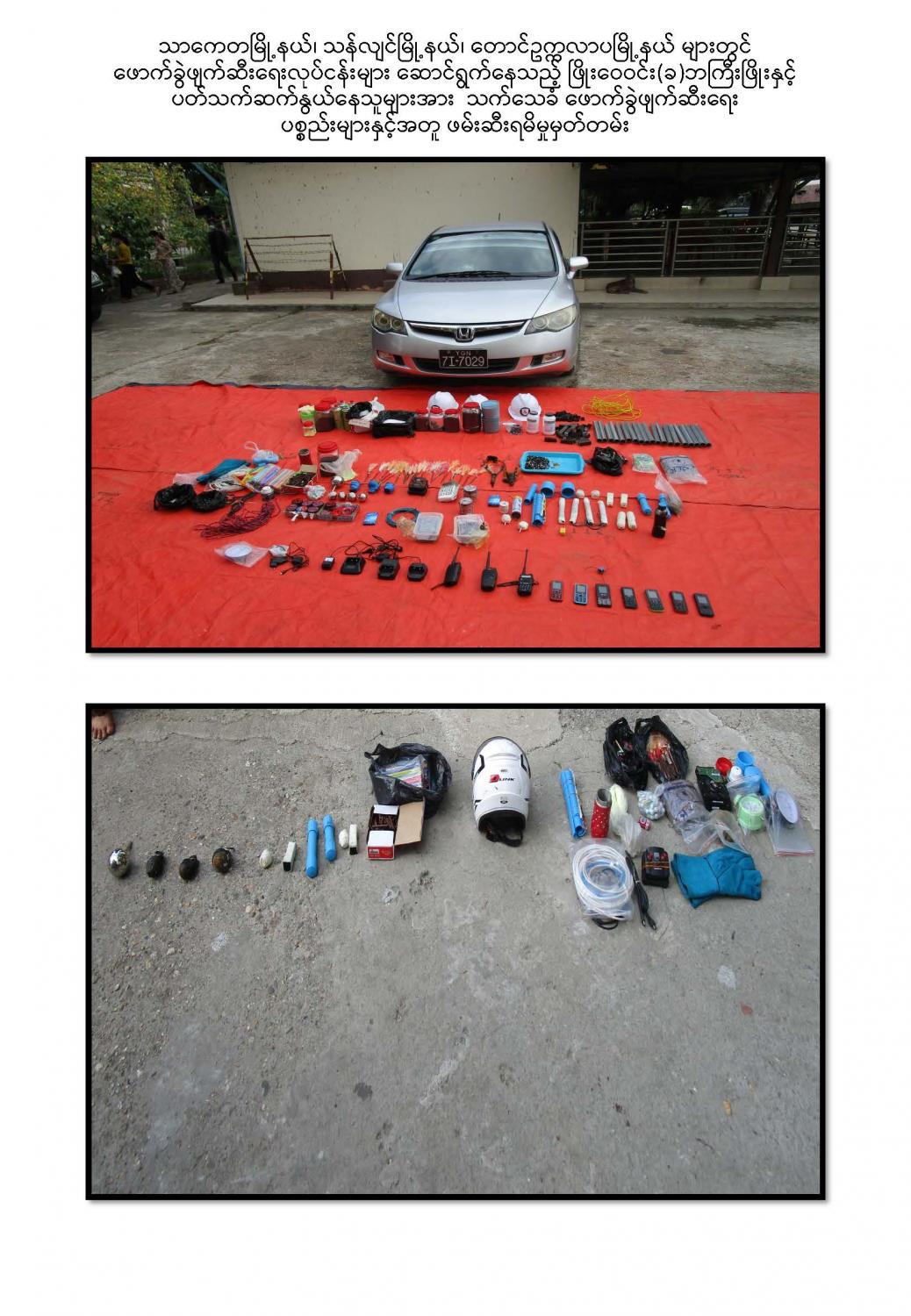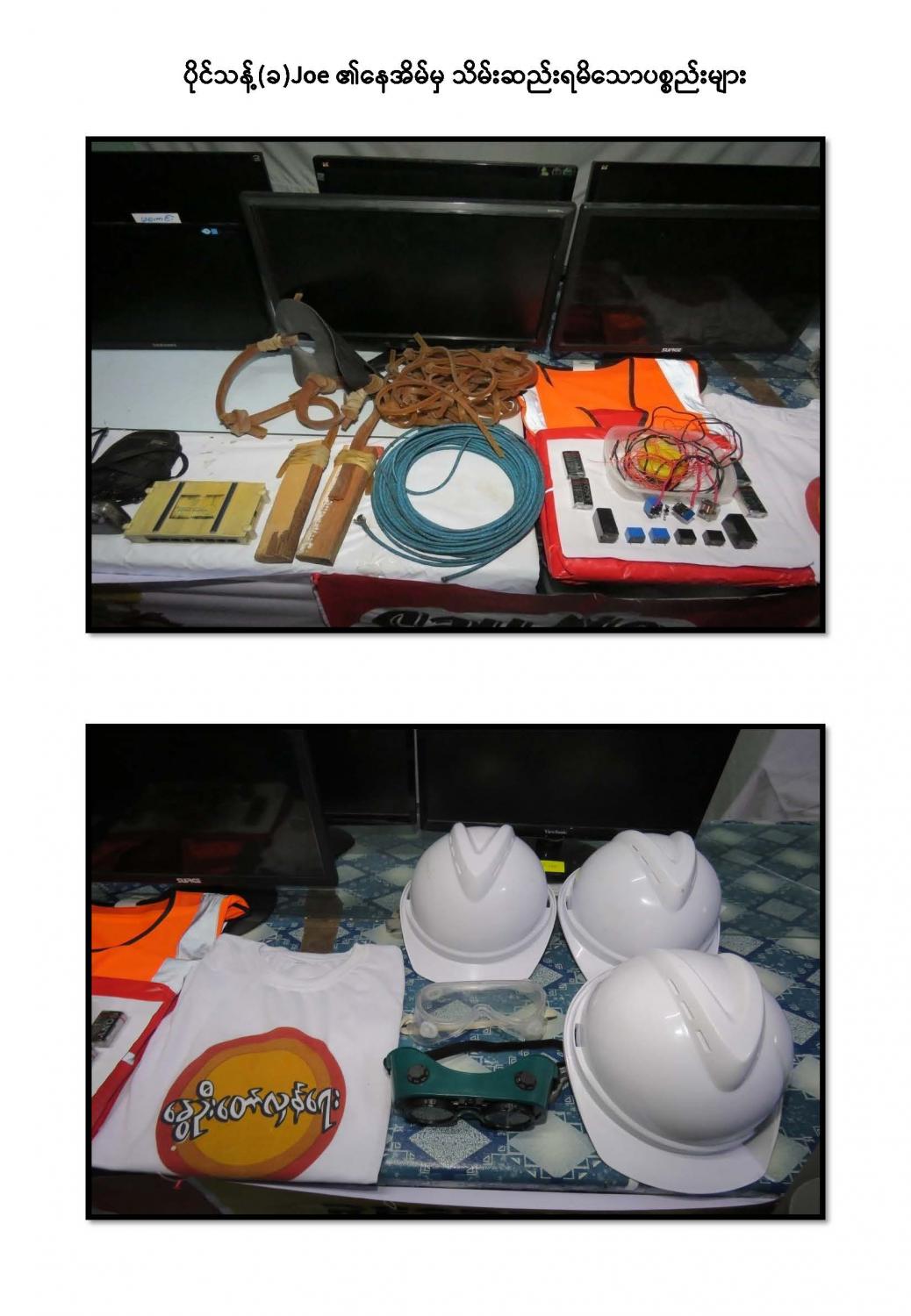 ဆက်လက်ထွက်ဆိုချက်အရ ဧပြီ ၁၈ ရက်တွင် ကယားပြည်နယ် အတွင်းရှိ တိုင်းရင်းသားလက်နက်ကိုင်အဖွဲ့အစည်းတစ်ခုထံသို့ စစ်သင်တန်း တက်ရောက်ရန် စီစဉ်နေသူ ကောင်းဆက်စိုး၊ ၂၀ နှစ်၊ (ဘ)ဦးဆန်းလွင်ကို ရန်ကင်းမြို့နယ်ရှိ ၎င်း၏ နေအိမ်တွင်လည်းကောင်း၊ ပိုင်သန့်(ခ)Joe ၊ ၃၂ နှစ်၊ (ဘ) ဦးဆန်းမြိုင်ကို မရမ်းကုန်း မြို့နယ်၊ အမှတ်(၆)ရပ်ကွက်၊ ရွှေရတနာလမ်း၊ အမှတ်(၁၈/A-1/D)ရှိ ၎င်း၏နေအိမ်တွင် ယမ်းမှုန့်အဖြူရောင် ၂ ပိဿာခန့်၊ ယမ်းမှုန့် အဝါရောင် ၅၀ ကျပ်သားခန့်၊ ယမ်းကြိုးခွေ ပေ ၃၀ ခန့်၊ ဆန့်ကျင်ရေးစာသားပါ ဗွီနိုင်းမျိုးစုံ ၇၃ ခု၊ ကွန်ပျူတာ၊ ဆက်စပ်ပစ္စည်း များနှင့် အခြားအသုံးအဆောင် ပစ္စည်းများအပါအဝင် အကြမ်းဖက်ရာတွင် အသုံးပြု သည့်ပစ္စည်းများနှင့်အတူ ဖမ်းဆီးရမိခဲ့သည်။
