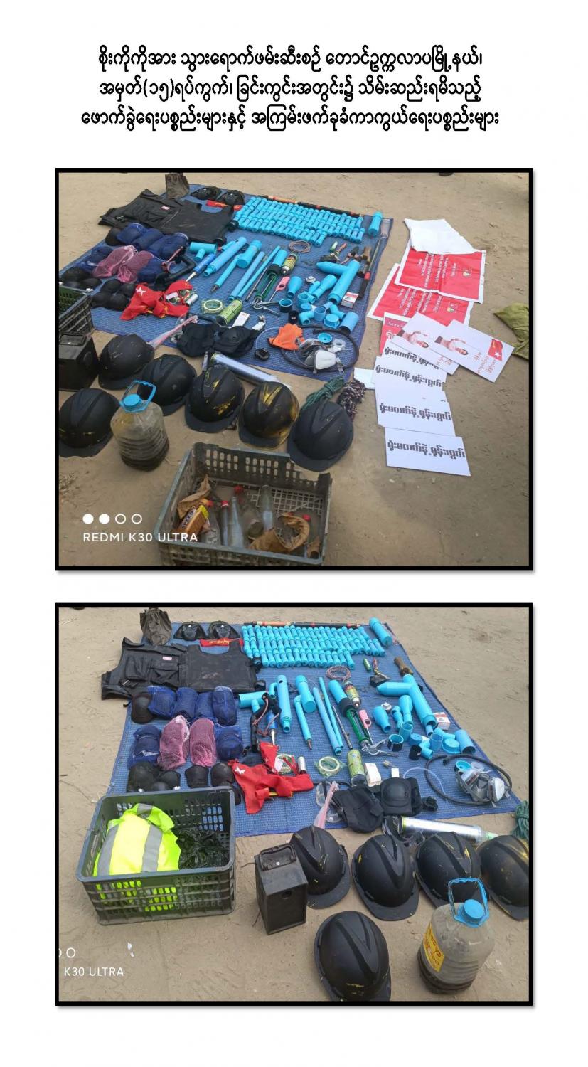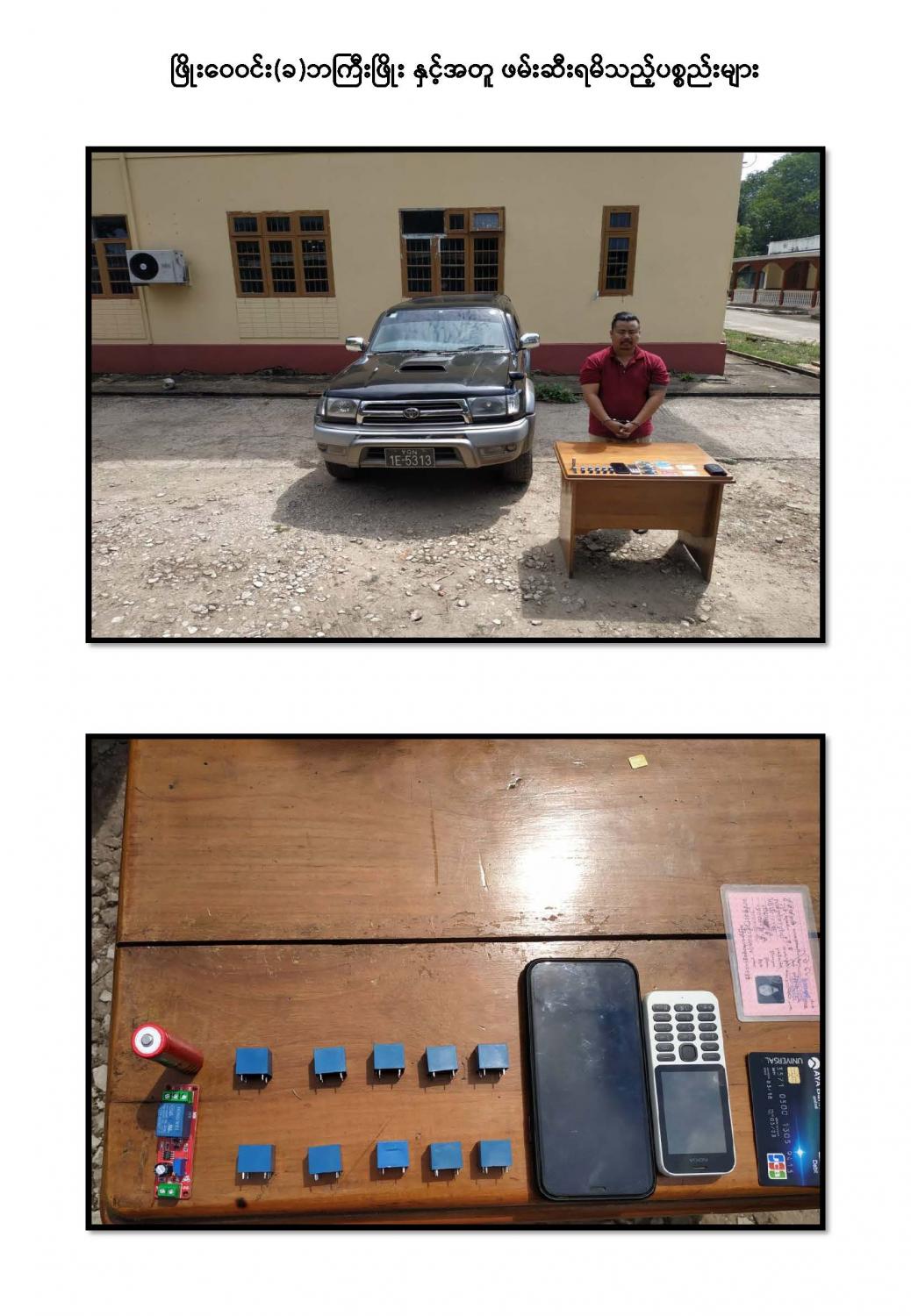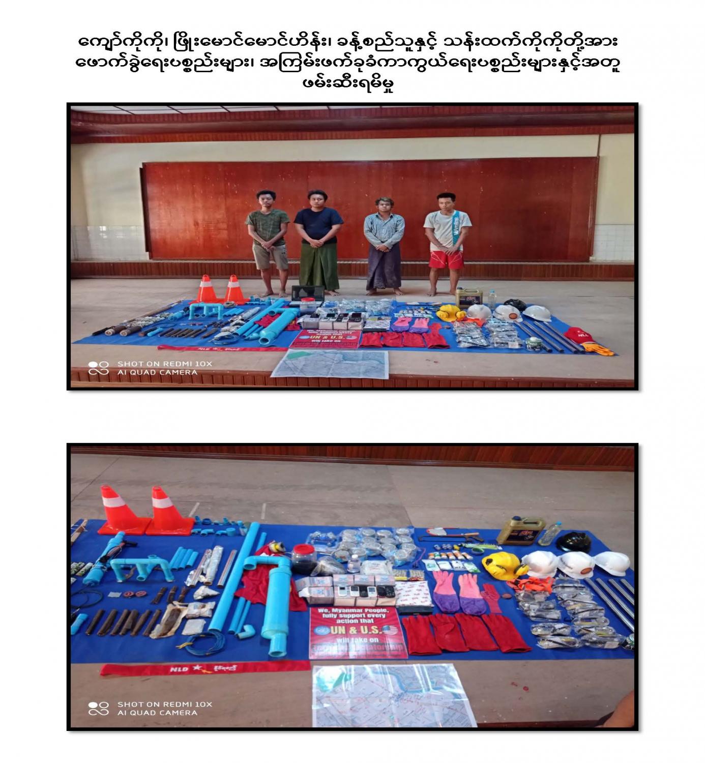 ဆက်လက်ထွက်ဆိုချက်အရ ဧပြီ ၁၈ ရက်တွင် ကယားပြည်နယ် အတွင်းရှိ တိုင်းရင်းသားလက်နက်ကိုင်အဖွဲ့အစည်းတစ်ခုထံသို့ စစ်သင်တန်း တက်ရောက်ရန် စီစဉ်နေသူ ကောင်းဆက်စိုး၊ ၂၀ နှစ်၊ (ဘ)ဦးဆန်းလွင်ကို ရန်ကင်းမြို့နယ်ရှိ ၎င်း၏ နေအိမ်တွင်လည်းကောင်း၊ ပိုင်သန့်(ခ)Joe ၊ ၃၂ နှစ်၊ (ဘ) ဦးဆန်းမြိုင်ကို မရမ်းကုန်း မြို့နယ်၊ အမှတ်(၆)ရပ်ကွက်၊ ရွှေရတနာလမ်း၊ အမှတ်(၁၈/A-1/D)ရှိ ၎င်း၏နေအိမ်တွင် ယမ်းမှုန့်အဖြူရောင် ၂ ပိဿာခန့်၊ ယမ်းမှုန့် အဝါရောင် ၅၀ ကျပ်သားခန့်၊ ယမ်းကြိုးခွေ ပေ ၃၀ ခန့်၊ ဆန့်ကျင်ရေးစာသားပါ ဗွီနိုင်းမျိုးစုံ ၇၃ ခု၊ ကွန်ပျူတာ၊ ဆက်စပ်ပစ္စည်း များနှင့် အခြားအသုံးအဆောင် ပစ္စည်းများအပါအဝင် အကြမ်းဖက်ရာတွင် အသုံးပြု သည့်ပစ္စည်းများနှင့်အတူ ဖမ်းဆီးရမိခဲ့သည်။
