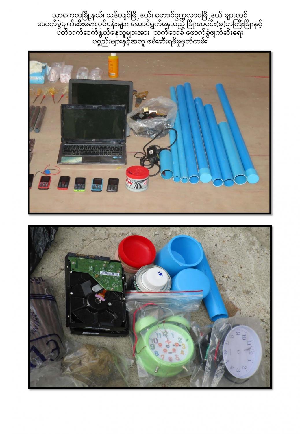 ဖမ်းဆီးထိန်းသိမ်းထားသူများ၏ ထွက်ဆိုချက်အရ မေ ၈ ရက်တွင် သာကေတ မြို့နယ်အတွင်းနေထိုင်သူ ခွန်ပြည့်ဖြိုး၊ ၂၆ နှစ်၊ (ဘ)ဦးဉာဏ်ထွန်း၊ ပြည့်စုံ၊ ၂၆ နှစ်၊ (ဘ)ဦးမောင်ဝင်း၊ ထက်အာကာ၊ ၂၂ နှစ်၊ (ဘ)ဦးခင်မောင်၊ ရာဇာဖြိုး၊ ၁၈ နှစ်၊ (ဘ)ဦးခင်ရွှေ၊ ရှိုင်းထက်အောင်၊ ၁၈ နှစ်၊ (ဘ)ဦးဇော်ဝင်း၊ ကိုကိုမောင်၊ ၃၄ နှစ်၊ (ဘ)ဦးစိုးသန့်၊ စစ်မင်းဟိန်း၊ ၂၃ နှစ်၊ (ဘ)ဦးစိုးလွင်နှင့် နန္ဒစစ်အောင်၊ ၂၁ နှစ်၊ (ဘ)ဦးဇေယျာလွင်တို့ကို ဖမ်းဆီးရမိခဲ့ပြီး ၎င်းတို့ ၈ ဦး၏ ထွက်ဆိုချက်အရ မေ ၉ ရက် တွင် သာကေတမြို့နယ်၊ ရှုခင်းသာလမ်းမကြီးရှိ Standard Lab ဓာတ်ခွဲခန်းကို စစ်ဆေးရှာဖွေရာ ဆိုဒီယမ်ကလိုရိုက် ၂ ဘူး၊ ယမ်းမဲ ၄ ဘူး၊ မက္ကနီဆီယမ် ၂ ဘူး၊ ပိုတက်ဆီယမ်နိုက်ထရိတ် ၁ အိတ်နှင့် ဆက်စပ်ပစ္စည်းများကို ဖမ်းဆီးထိန်းသိမ်းနိုင် ခဲ့သည်။