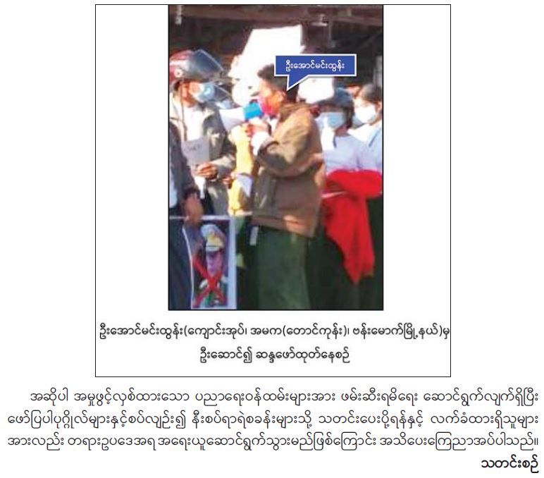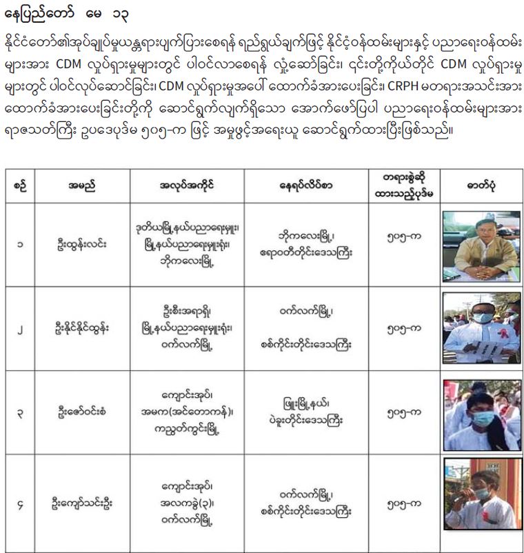 နိုင်ငံတော်တည်ငြိမ်အေးချမ်းမှုကို ပျက်ပြားစေရန်ရည်ရွယ်ချက်ဖြင့် CDM လှုပ်ရှားမှုတွင် ပါဝင်သည့် ပညာရေးဝန်ထမ်းများအား ရာဇသတ်ကြီးဥပဒေပုဒ်မ ၅၀၅-က ဖြင့် အမှုဖွင့် အရေးယူဆောင်ရွက်(၁၃-၅-၂၀၂၁)
